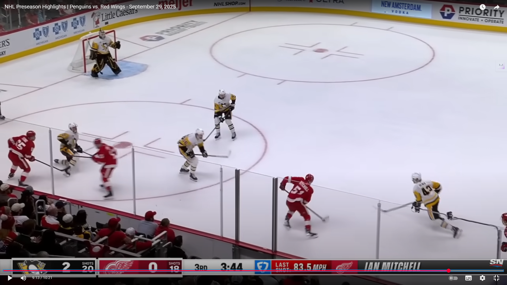 У «Пенс» осталось всего два предсезонных матча с «Баффало Сейбрс». Сегодня ночью состоится гостевая игра, в ночь с 3 на 4 октября по Москве — домашняя. После этого — пара дней отдыха и 5-дневная серия игр с командами из Нью-Йорка. Сначала в гостях в «Мэдисоне» с «Рейнджерс» и знаковая встреча с Майком Салливаном. Потом дома сначала с «Айлами», а потом снова с «копами» и теплый прием для Салливана от PPG Paints Arena.