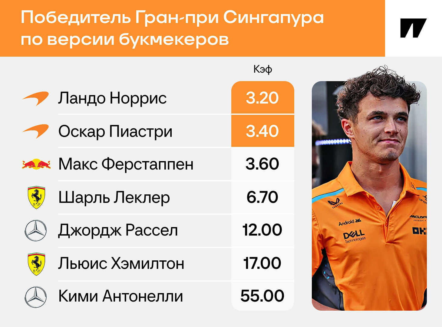 Победное шествие «Макларена» сбилось, и теперь линия на Сингапур выглядит непривычно: словно провалы британской команды обнулили сезон. Почти во всех гонках букмекеры выделяли Норриса и Пиастри, а Ферстаппен оставался в тени, заметно уступая по котировкам.