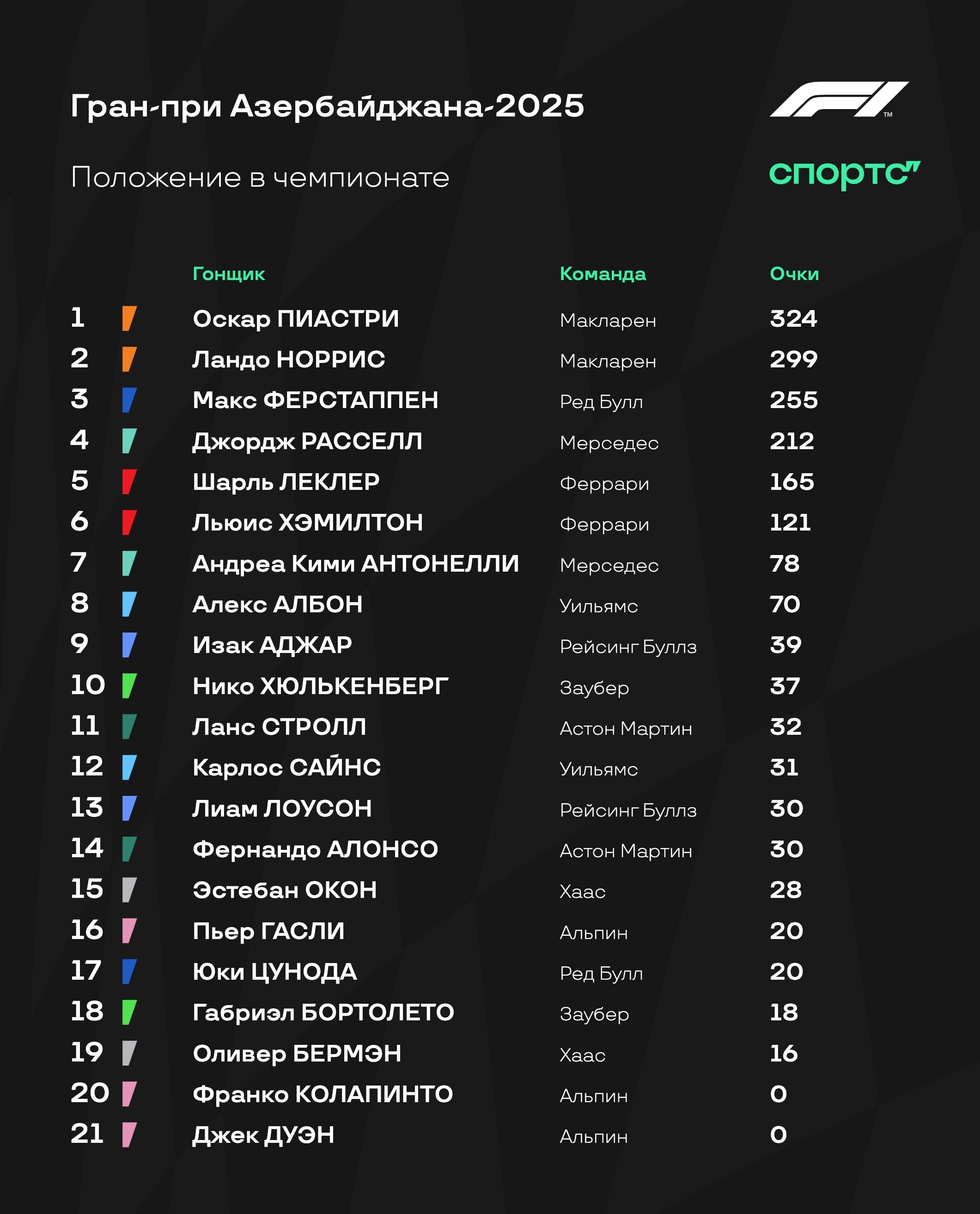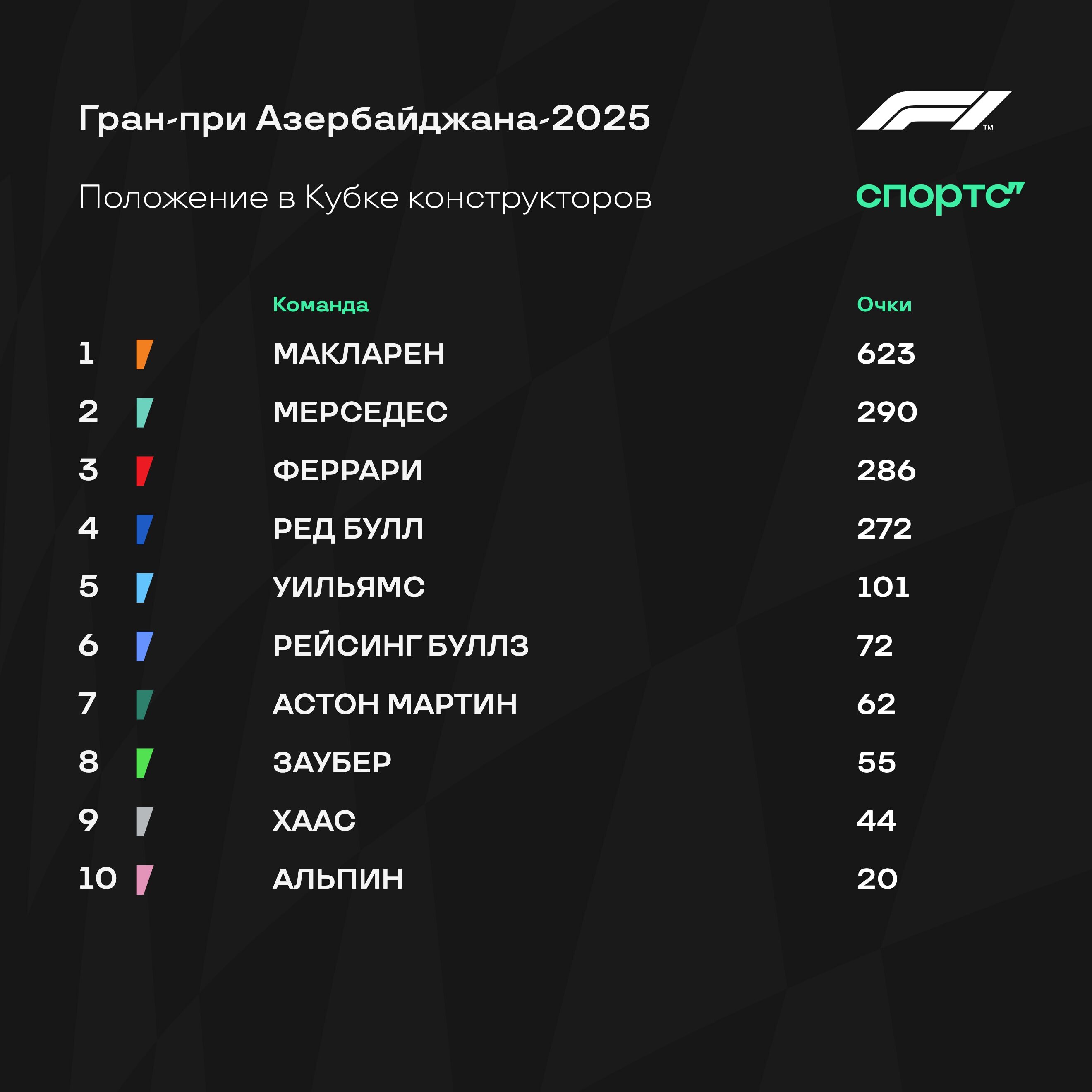 Тем временем накаляется борьба за второе место. После азербайджанского этапа «Мерседес» сместил «Феррари» со второй строчки, а «Ред Булл» более чем вдвое сократил отставание.