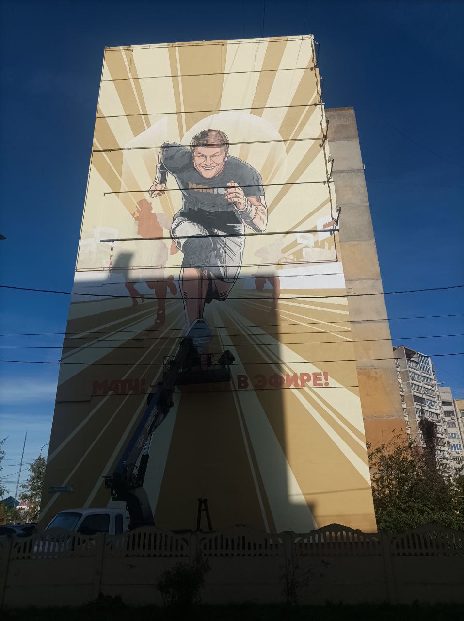 Днем в понедельник 29 сентября 2025 года увидел как с торца здания по улице Керченской (в непосредственной близости от стадиона ЧМ-2018) в Нижнем Новгороде начали создавать яркий и красочный мурал с небольшими нотками аниме в стилизации. Шел по улице с товарищем, с которым обсуждали его первый забег в марафоне и данное формирующееся живописное произведение органично встроилось в нашу беседу. Органика с бегущим человеком отлично вывела наш разговор со спортивной тематики в русло обсуждения искусства. Однако спустя 4 часа ситуация изменилась, поскольку у бегуна стали отчетливо формироваться черты лица, которые уж очень сильно напоминают сотрудника канала «Матч!» Дмитрия Губерниева.