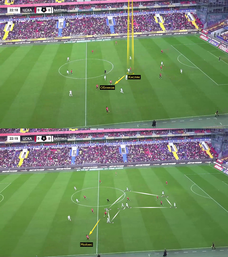 2. Середина не передерживает мяч. Кисляк в два касания отрезал четырех игроков «Балтики» (еще три потерялись на первой стадии атаки), а Обляков пасом Мойзесу создал ситуацию 4-в-3.