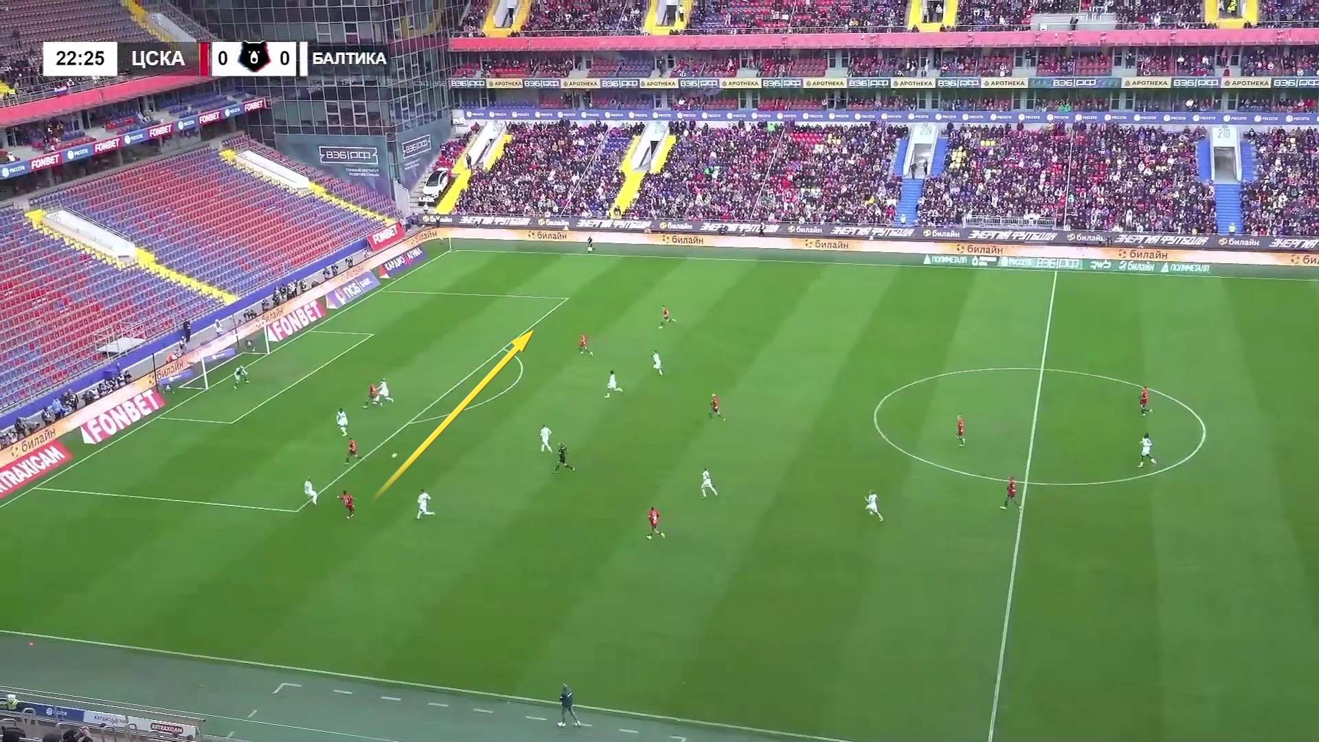 1. Оборона ищет короткие варианты для продвижения. Акинфеев отрезал прессинг «Балтики» короткой передачей, благодаря чему центральный защитник Жоао Виктор вывел мяч в центр.