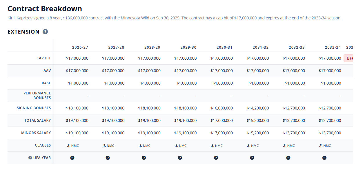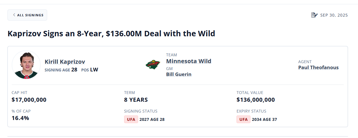 Скорее, пример этой сделки будет использоваться в медиа, как оправдание своих заключенных контрактов со звездами с переплаченным AAV, по типу – да вы на сумму Капризова посмотрите. Тем более, во всех фронт-офисах прекрасно понимают мотивы заключения нового договора Миннесотой с Кириллом на такую сумму. Это сознательное бизнес-решение владельца клуба о переплате по контракту своему звездному игроку являющимся лицом франшизы.