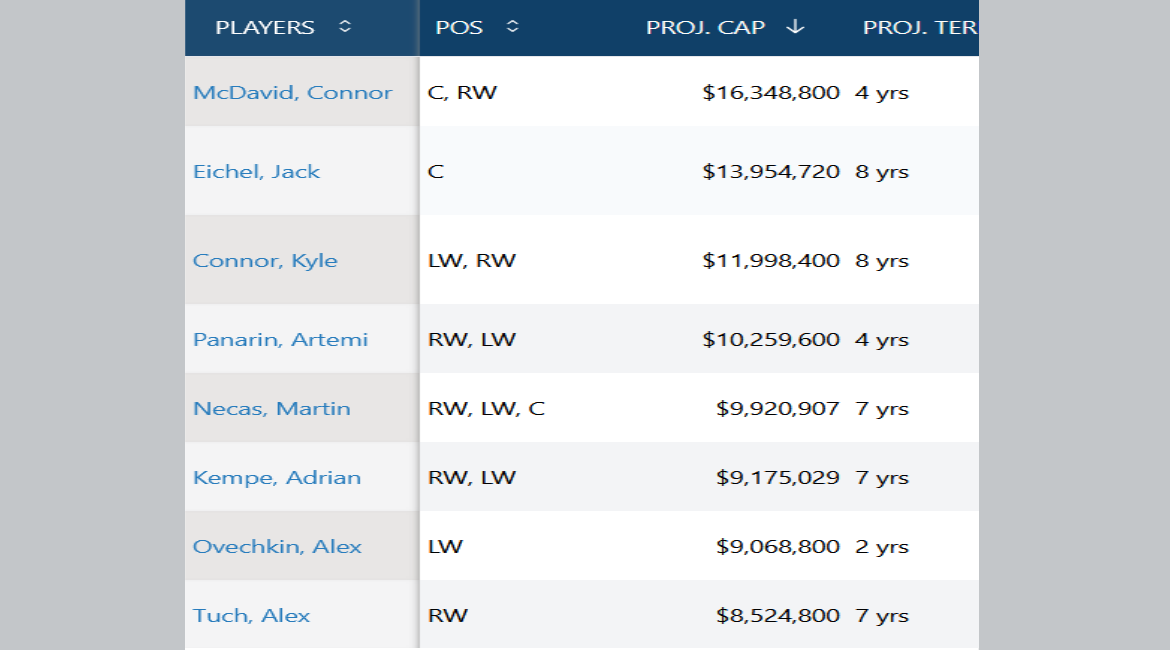 Как же это рекордное соглашение повлияет на контракты с другими звездами. В медиа циркулируют разные предположения. Я думаю, что наибольшее влияние будет со временем, т.к пройдена пороговая цифра. Но даже в пике влияние будет не слишком большое. На предстоящих звездных UFA 26 пока не особо, хотя определенный сдвиг будет, но больше на звездах будущих заключать контракт в статусе RFA со своими клубами. Вот список лучших UFA 26 с прогнозам по контракту от AFP Analytics.