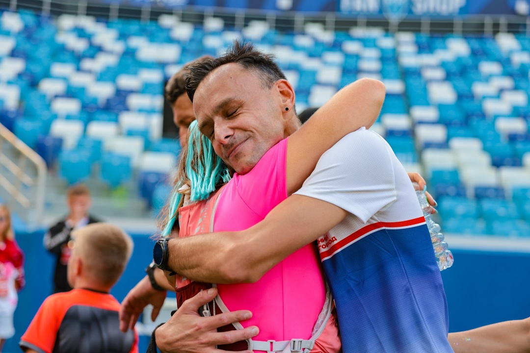 Честно, смутно помню какие-то подробности, ощущений в первые секунды. Наташа и Юля ждут на Финише. Падаю на Наташу совсем без сил. Наташ стойко меня держала и терпела…Спасибо! После объятий Наташи, настроение поднялось, с Юлей уже улыбаюсь, радуемся, что мы смогли. Что-то говорим другу – другу, уже не помню.
