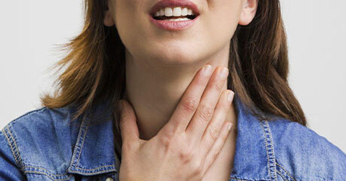 Иногда щитовидка увеличивается или в ней образуются узлы. Даже небольшое увеличение может давить на пищевод и трахею. Из-за этого появляются неприятные ощущения в горле: ком, сдавленность, трудности при глотании.