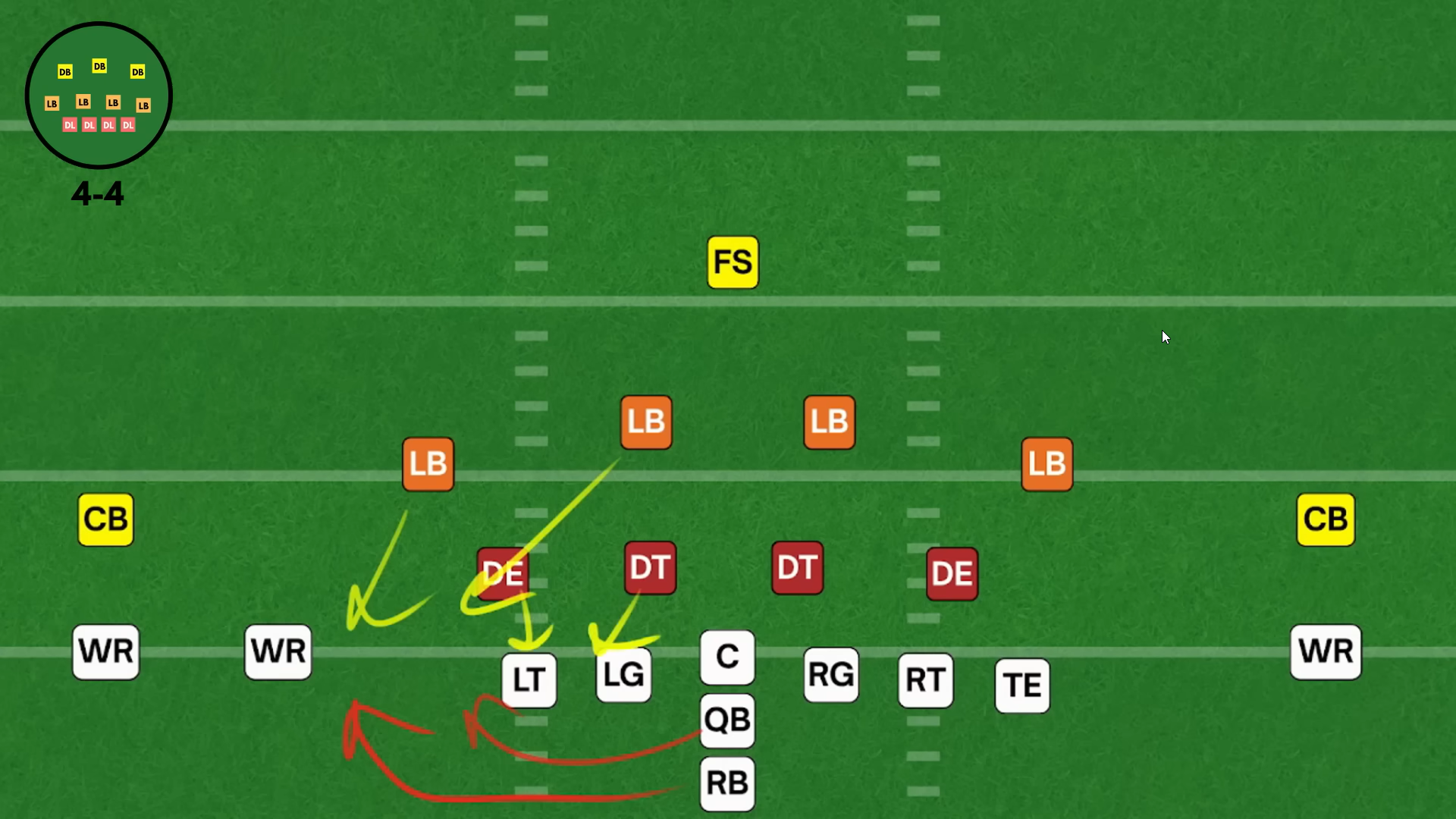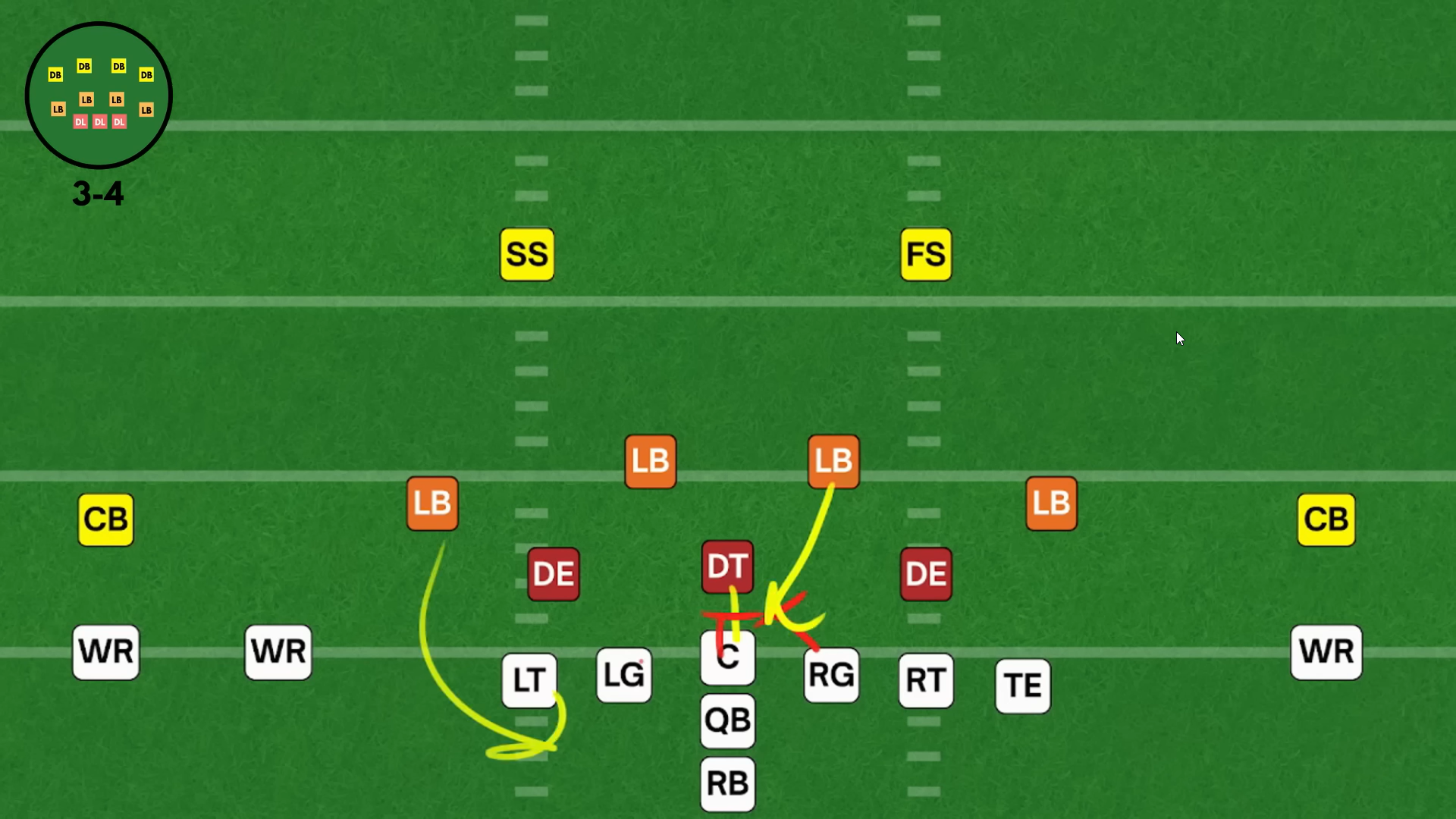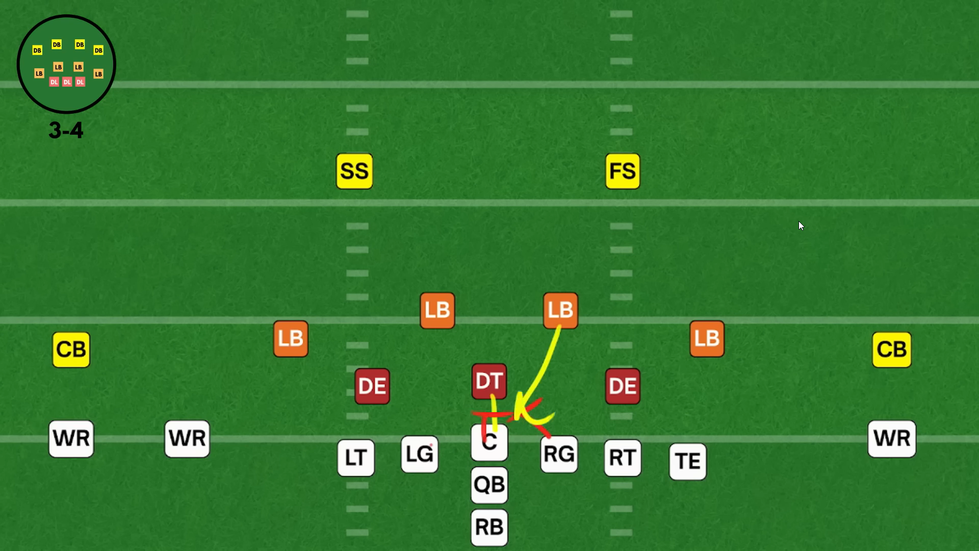 Поскольку атака часто чертит против ноуз-тэкла, центрального лайнмена в линии, двойные блоки, это позволяет освобождать внутренним лайнбекерам проходы и пространства, ➡️