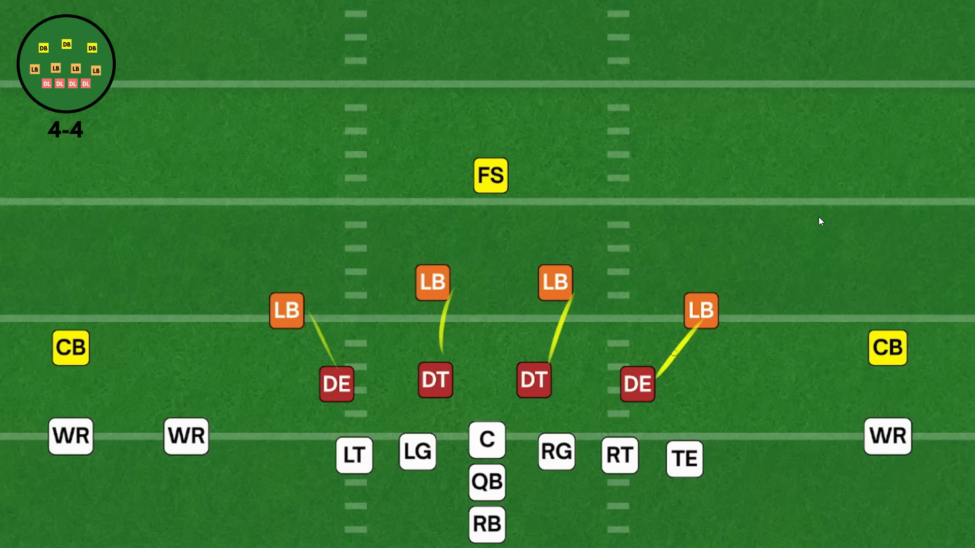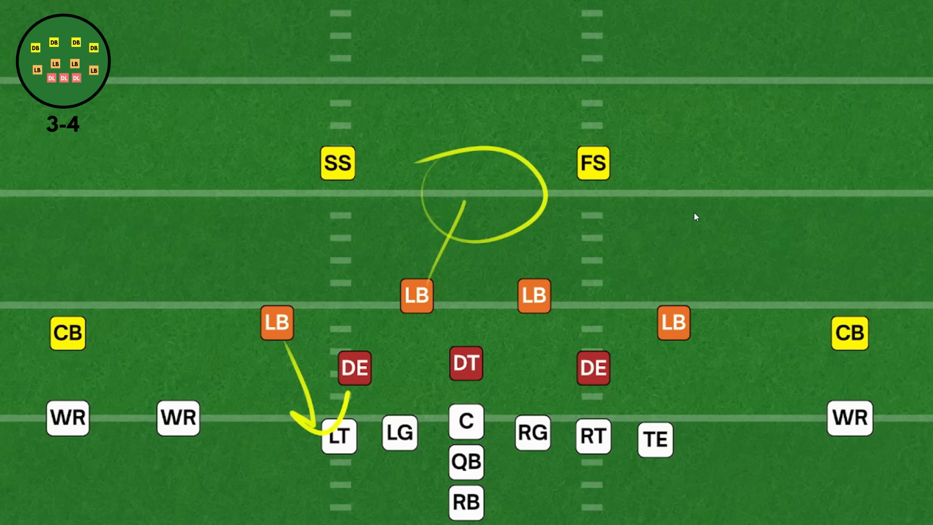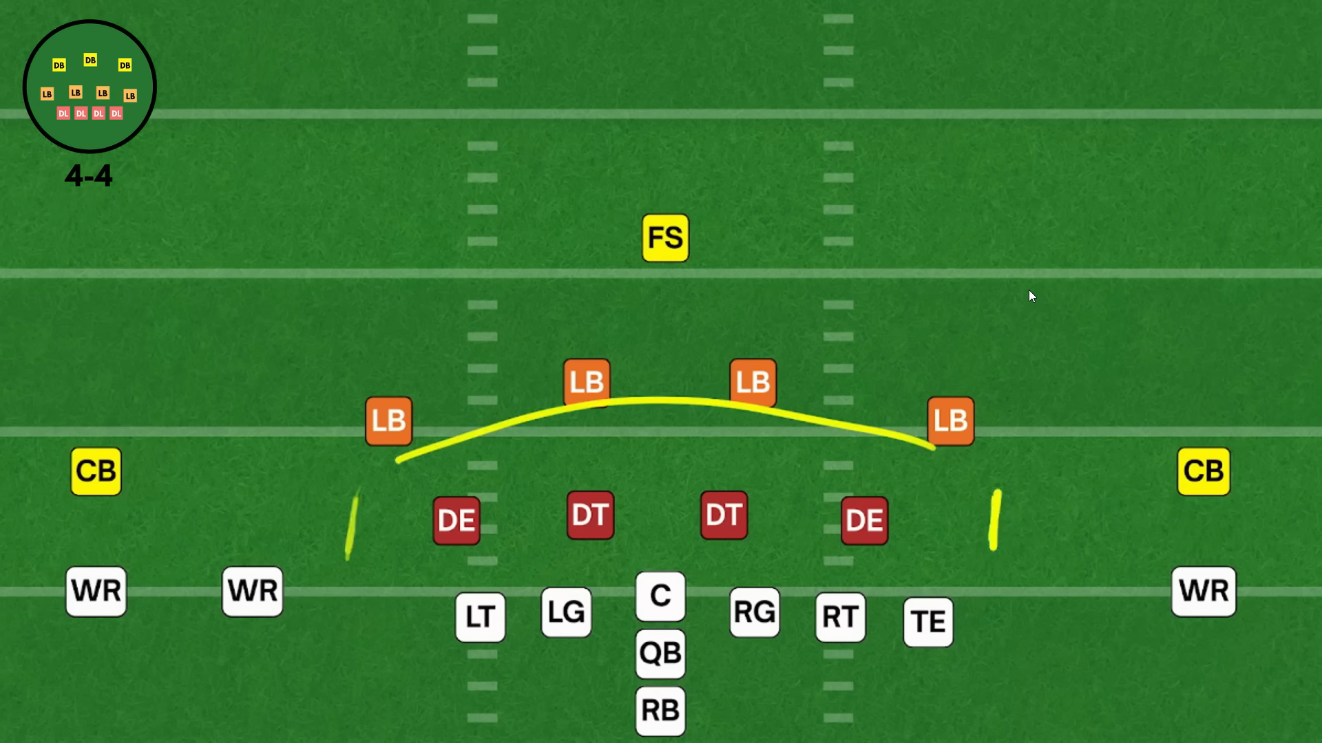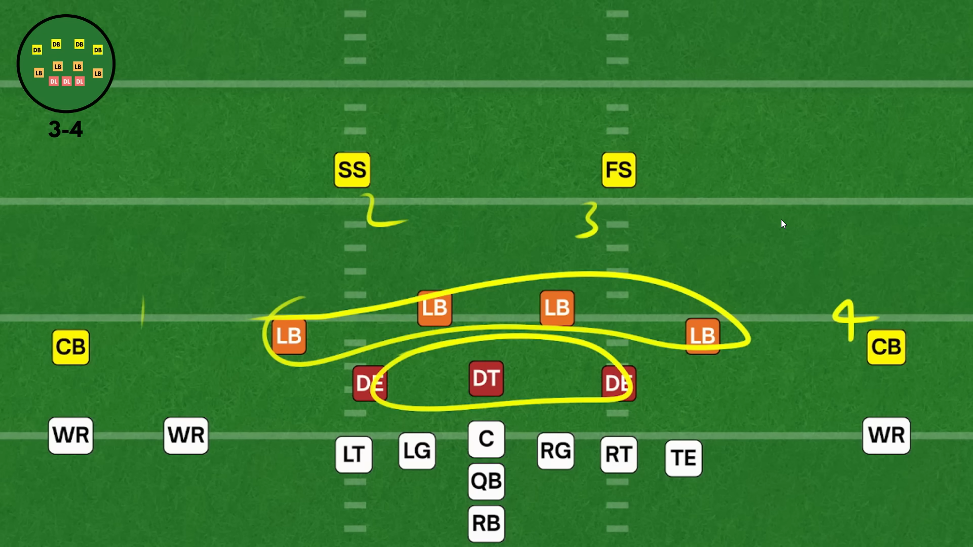 В данной формации четыре лайнбекера расположены ради контроля за краями линии атаки, то есть за пространством, внешним по отношению к тэклам нападения (OT), ➡️
