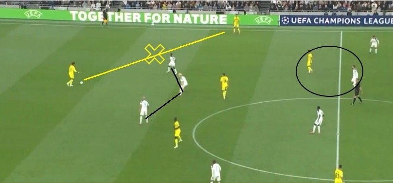 Томас Франк тоже перекрыл «Вильярреалу» кислород в центре, но сделал это чуть иначе – тройка нападающих «Тоттенхэма» располагалась очень узко в первой стадии и перекрывала линии передач на полузащитников, вынуждая пасовать во фланги. В отличие от «Атлетико», Франк не использовал постоянный прессинг, а врубал его лишь эпизодически.