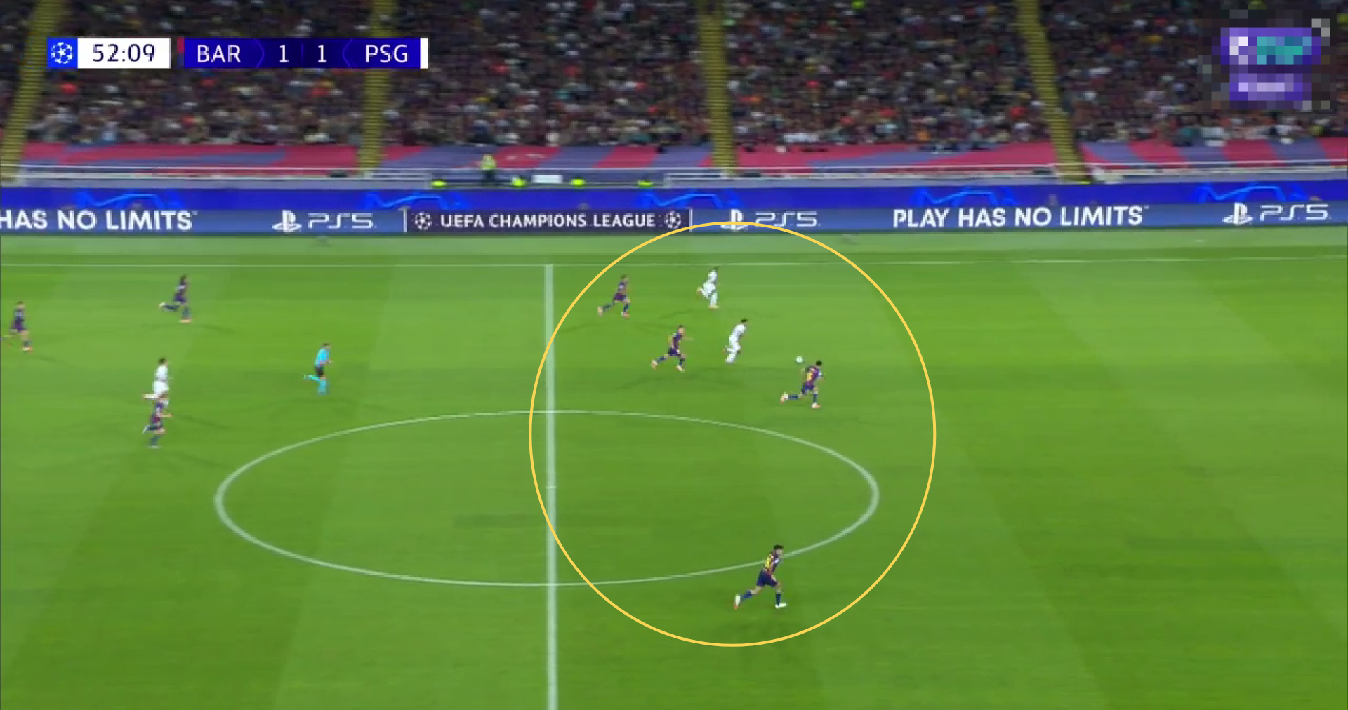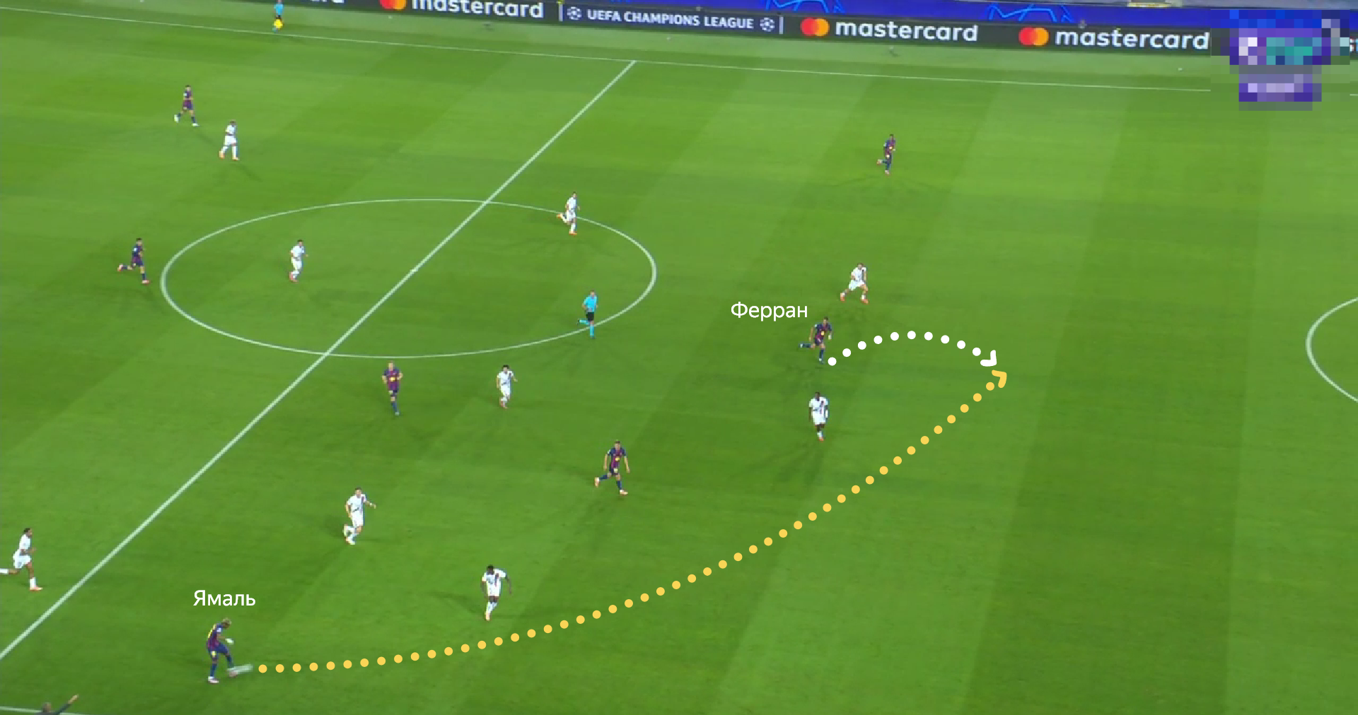 В данном эпизоде уже сам открывался под пас от Ямаля. Защитники парижан действовали в активной манере и часто выдвигались за своими оппонентами. Поэтому у футболистов «Барсы» периодически появлялась возможность находить свободное пространство.