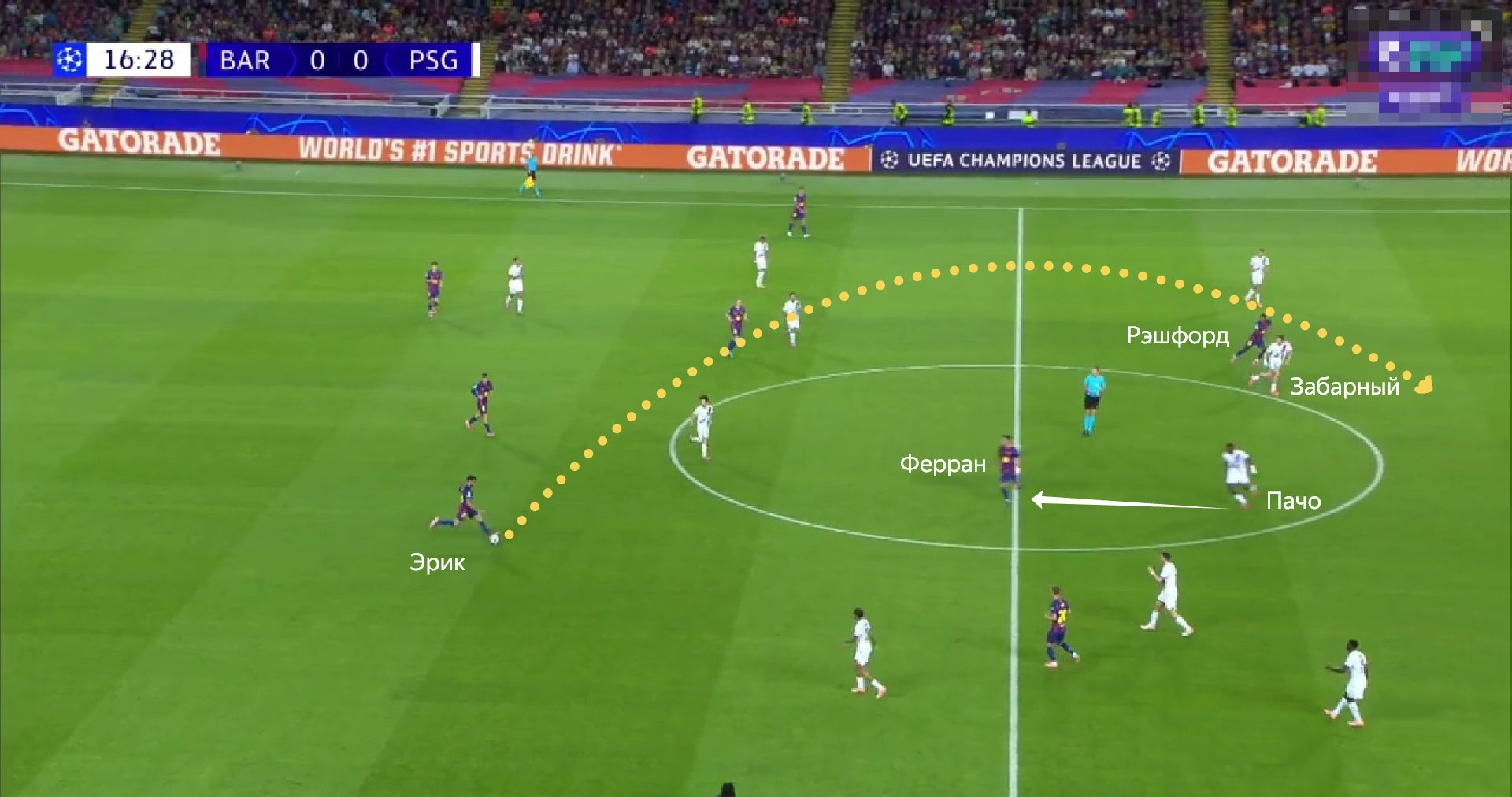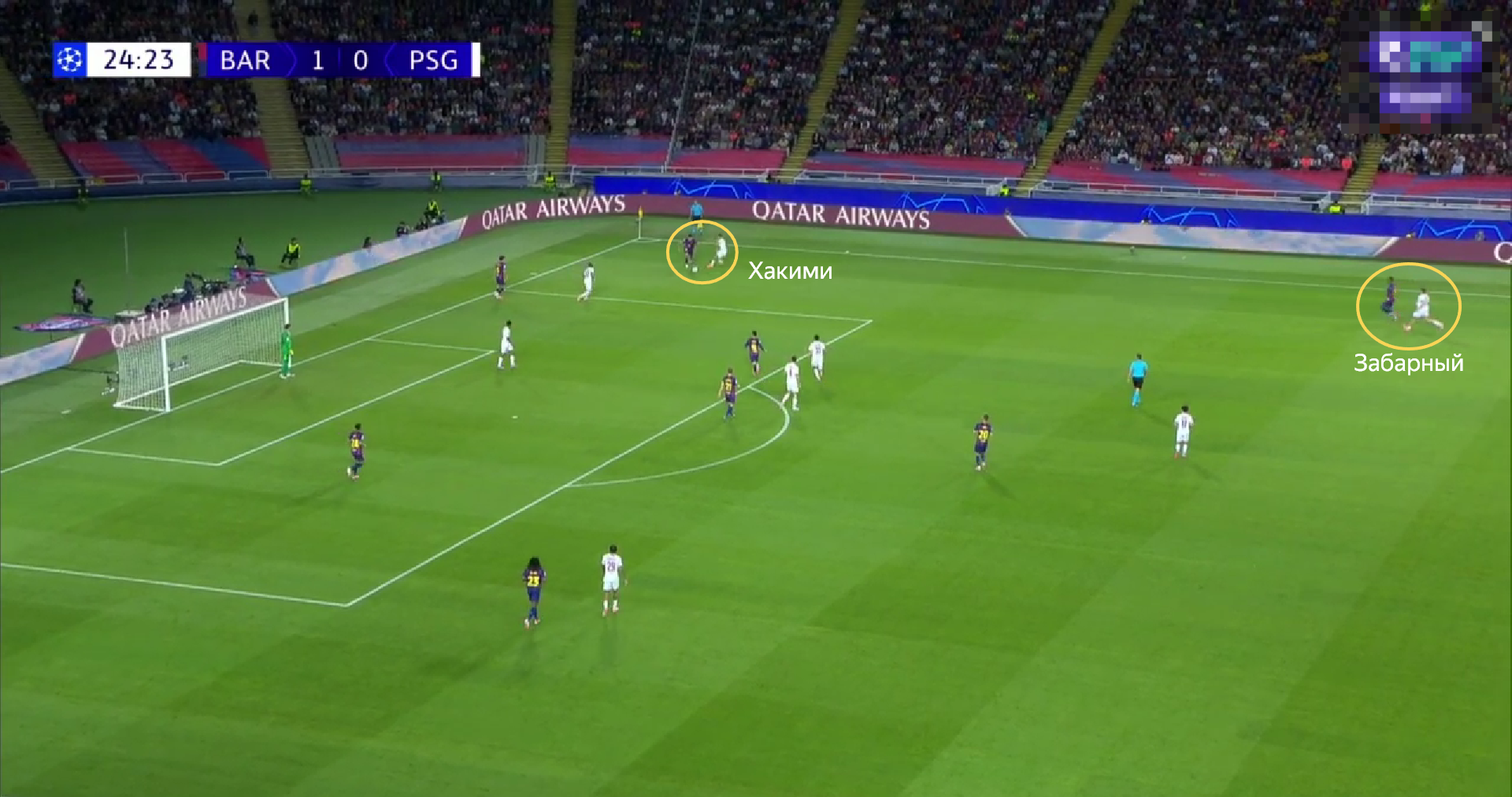 Например, здесь Хакими активно пошел в прессинг. Забарный сместился на фланг, чтобы его подстраховать. В результате «Барса» смогла выйти из-под давления в атаку на свободном пространстве.