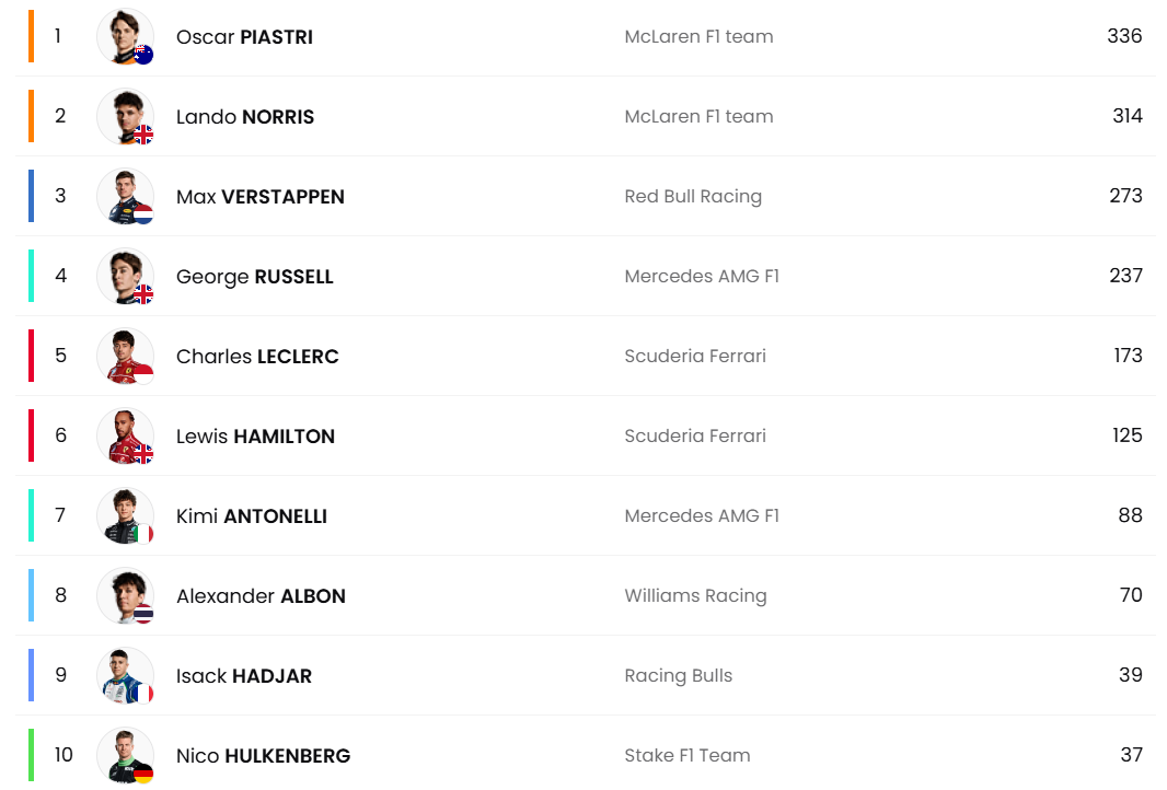 Борьба за личный титул стала максимально напряженной. Оскар Пиастри сохранил лидерство с 336 очками, опережая Ландо Норриса на 22 очка (314 очков). Макс Ферстаппен, несмотря на второе место, отстал на 63 очка, что делает его шансы на титул весьма призрачными.