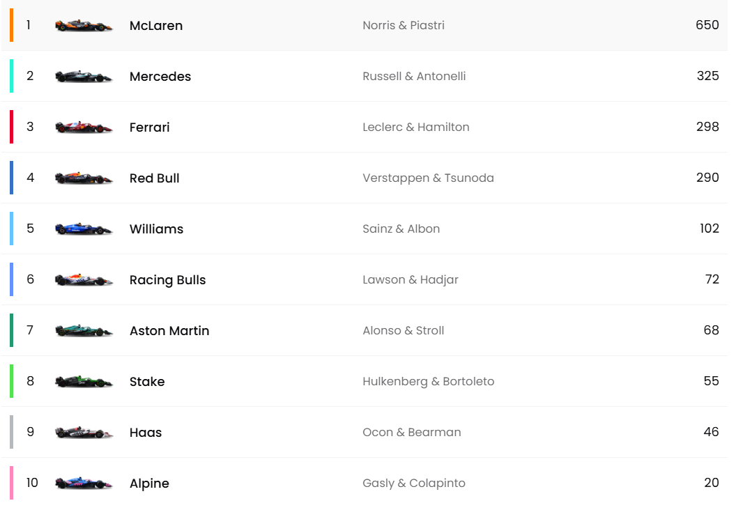 Это достижение было подчеркнуто значительным отрывом от ближайшего преследователя: «Макларен» набрала 650 очков, что ровно вдвое больше, чем у «Мерседеса», занявшей второе место с 325 очками.