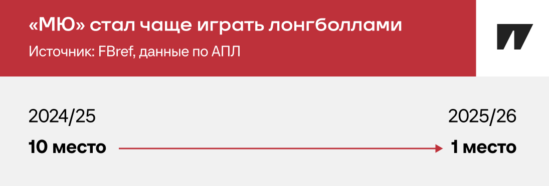 Игровая модель «МЮ»-2025/26 строится на прямолинейном переходе из первой фазы (от центральных защитников) сразу в третью (к атакующим полузащитникам). Если в прошлом сезоне длинные передачи были для «Юнайтед» лишь инструментом, то теперь стали чуть ли не единственным способом доставки мяча на половину соперника.