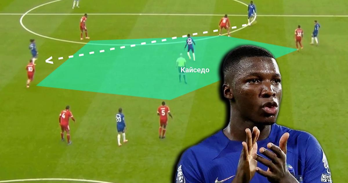 Марк, как и в моменте с голом, снова видит Кайседо в опорной зоне без опеки, поэтому и идет к мячу, чтобы сохранить нужный угол передачи для возможного паса на Мойзеса