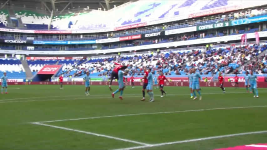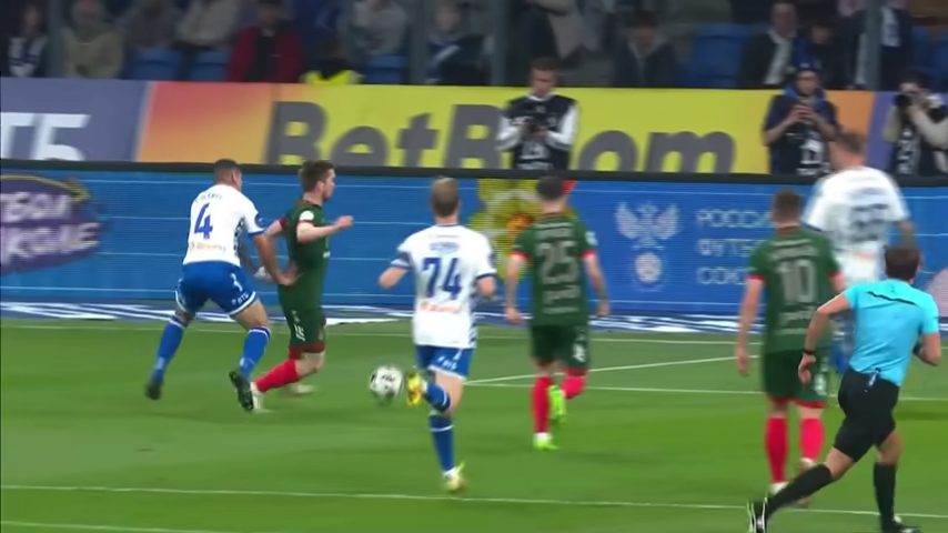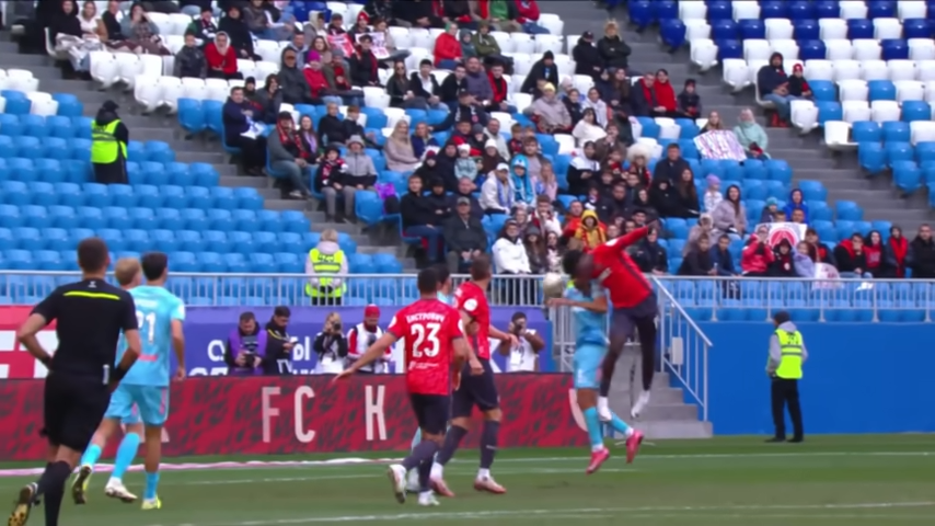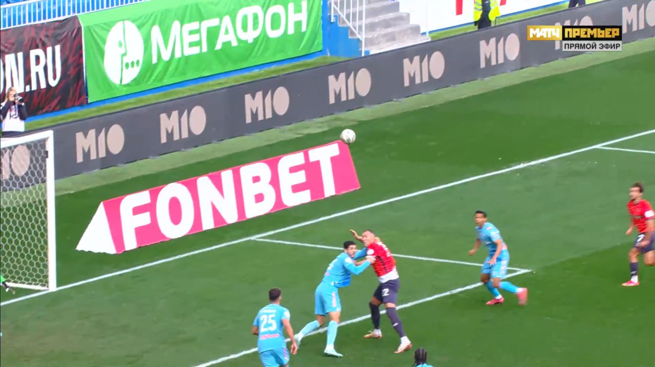 Обороняющийся игрок держит соперника 2 руками, атакующий - одной, а мяч летит где-то вверху и в сторону. Ну это скорее просто о том, что никакого пенальти в ворота Махачкалы назначать было нельзя, тем более - после вмешательства ВАР. Но все же до конца первого тайма Акрон счет сравнял - на 35 минуте после кросса с фланга Сантос попытался сыграть головой на опережение и выбить мяч, но тот после рикошета от боровшегося с ним Севикяна в дальний угол ворот таки спланировал. Второй тайм начался вроде опять атаками Зенита, но до реально голевых шансов дело не дошло. Зато к концу игры у хозяев опять начали получаться моменты после кроссов в штрафную. И если гол, забитый на 88 мин. оказался не легитимным из-за «вне игры», то на первой добавленной после кросса и попытки удара Беншимола мяч попал в выставленную не то что в сторону, а просто на уровень плеча, руку Сантоса