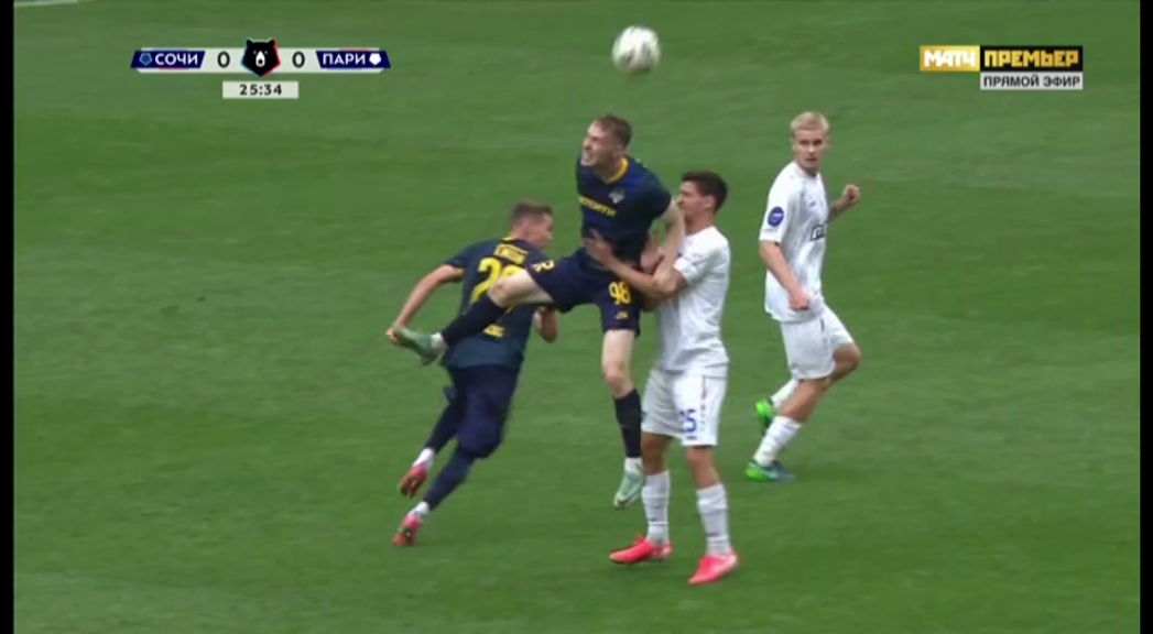 Все бы ничего, но через 8 секунд после отбора Ильин, который уже должен был быть в раздевалке из-за КК, забивает гол. На наш взгляд фол случился в одной АРР (attacking phase of play) по версии ДСИ, но не для Кзарцева. Очень долго он проверял его, но в конце концов решение Карасева о взятии ворот оставил в силе. Так сказались ксенофобия ВАР ассистента к гражданам Республики Беларусь (его старый враг Ганчаренко, как и нынешний тренер Пари НН Шпилевский - граждане братской республики), или просто нелюбовь к команде Пари НН - неизвестно, но факт остается фактом: лидерство в матче хозяевам он обеспечил. Во втором тайме Боселли все-таки счет сравнял великолепно исполненным штрафным - уже второй его гол в этом сезоне после такого стандарта. Но ничья продержалась недолго - через пару минут защитник гостей нарушил правила на Ежове и хозяева забили добиванием после пенальти. Претензии на КК для Кастильо здесь неуместны - хоть в мяч он и не играл, но в борьбу вступил