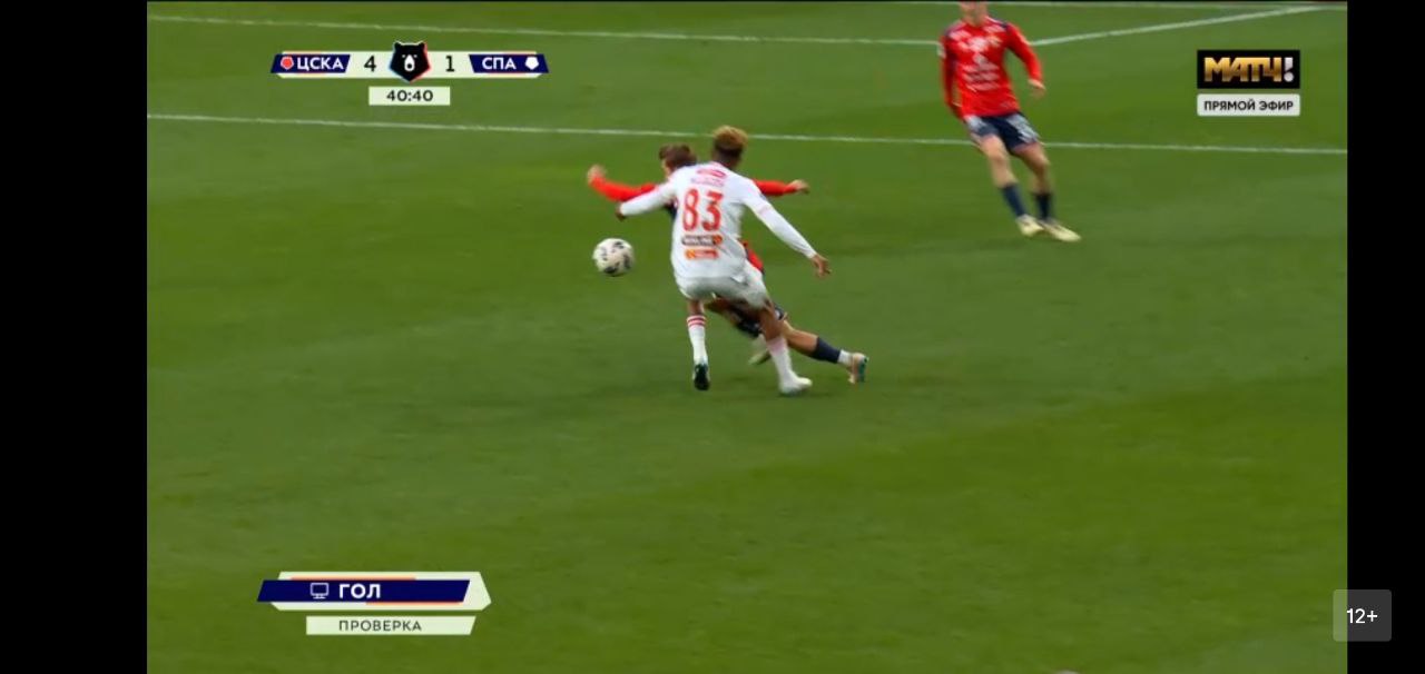 .Учитывая первый скрин, понятно почему ВАР позвал судью к монитору - Чистяков просто не видел момент контакта. Так что это не был случай определения географии, когда судью в поле не зовут, Чистяков зафиксировал другой фол, а не тот, что привел к пенальти. Хотя конечно сам пенальти - нелогичный и обидный для КБ - воротам то никакой угрозы не было, игрок вообще выходил из штрафной. Но что поделать - а РПЛ такие пенальти ставят постоянно, не далее как в 9 туре в ворота Оренбурга назначили такой же, в игре с Динамо Мск. Но на этом неприятности гостей не закончились - после реализованного Обляковым пенальти ЦСКА на 17 минуте забил еще раз. Еще один россиянин из атакующей группы ЦСКА - Круговой - отличился тонким подставлением ноги под пас - прострел того же Аллерандро, поймав Максименко на противоходе. Правда через 3 минуты один гол гости отыграли - виновник пенальти Жедсон подключился на дальнюю штангу при угловом и почти внес мяч в ворота. А еще через 3 минуты уже Алвес бил по пустым воротам из-за штрафной, но защитник мяч зацепил и тот по плавной дуге опускался в ворота, куда успел вернуться Максименко. Самый однако важный момент с точки зрения судьи случился на 38 минуте игры, когда после очередной быстрой атаки ЦСКА Круговой забил четвертый мяч. ВАР его смотрел очень долго из -за контакта мяча с рукой Облякова в начале атаки: