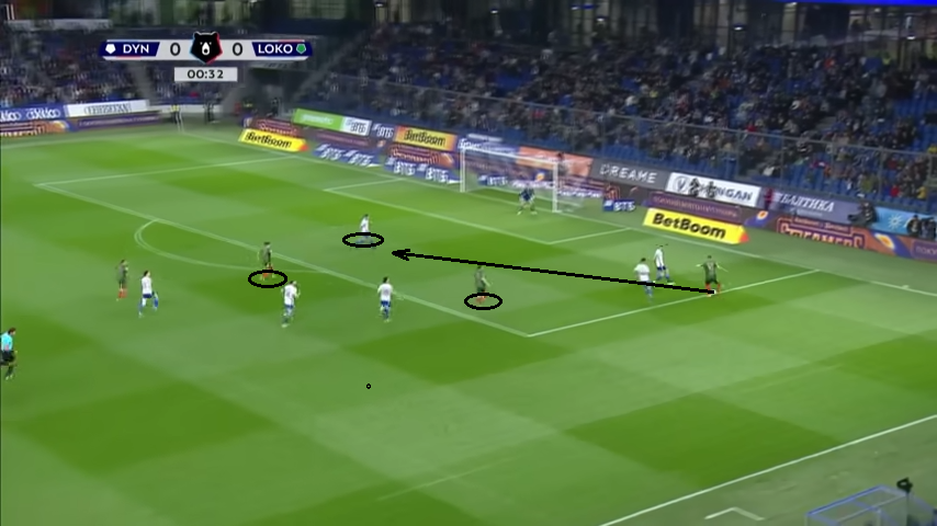 Обратите внимание на игроков Динамо - их 9 на чужой половине, когда мяч уже в продвинут игроками соперника до 12 ярдов от центра поля. Продолжение идет переводом в свободную зону в центр на игрока атаки
