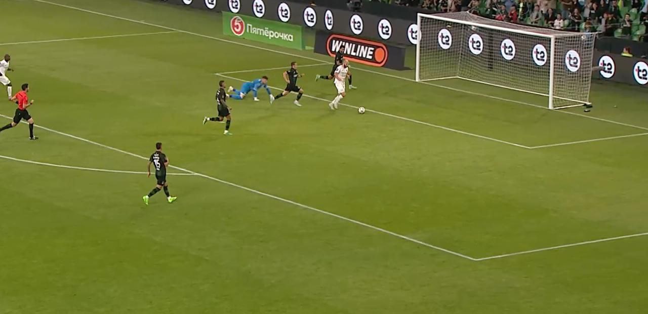 Спокойный матч сменился огненным: Краснодар принимал Ахмат, с четвертого тура не знавший поражений после прихода Черчесова. И уже на первой минуте Мелкадзе должен был забивать, но не попал в ворота из вратарской. Через минуту Касинтура пробивал почти с одиннадцатиметровой отметки, но его удар приняли на себя защитники. Краснодар никак не мог перехватить инициативу, но помогло необычное решение Кордобы - он решился на дальний удар с xG всего 0,02 на 14 минуте, и Шелия пропустил между поднятых рук. Но гости не сдавались, и через десяток минут Мелкадзе не использовал «момент тура» - обычно мы приводим скрины только судейских моментов, но как можно не забить отсюда?