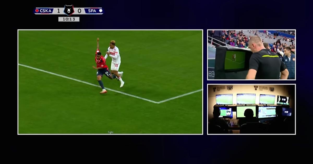 а когда обернулся - увидел только задержку рукой от спартаковца и назначил штрафной. Но, как заметил ВАР Мешков, еще до этого был контакт ногами между ними, который случился еще в штрафной Спартака