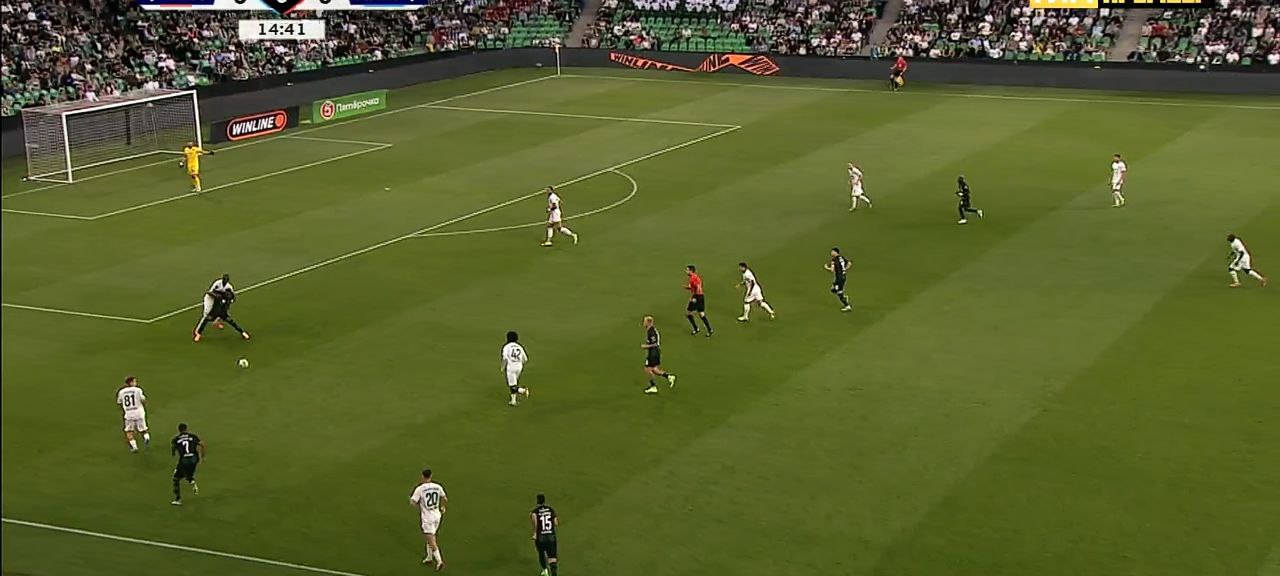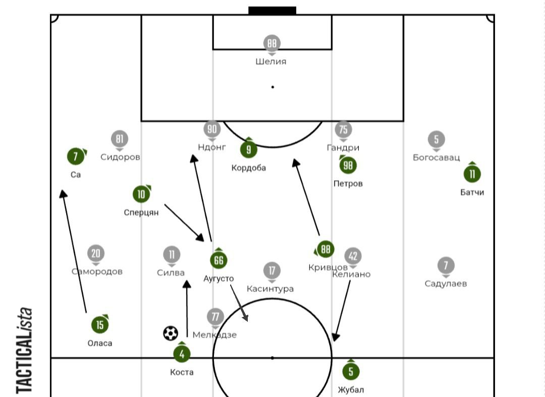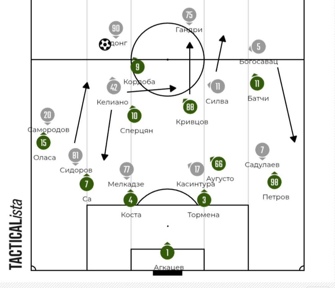 Выглядело это примерно так: вингеры отвечают за ширину, Касинтура работает по всей ширине поля, Сидоров постоянно подключается в полуфланг (реже оставался ложным фулбэком), Богосавац чаще остается в билд-апе (мог быть как в первой тройке, так и ложным фулбэком в центре), Силва также остается для розыгрыша, а Келиано может как оставаться в начале атаки, так и насыщать атакующую линию. Основная угроза тут исходила от Касинтуры из-за его огромного объема перемещений, и Мелкадзе, до которого Сидоров пару раз очень удачно доставил мяч. При этом первая тройка оставалась достаточно глубоко, чтобы сохранять численное преимущество при контратаках. Правда тут нашлась дыра – Силва и Богосавац играли левее, так что Сидорова страховать было некому, за счет чего правый фланг обороны был очень уязвим.