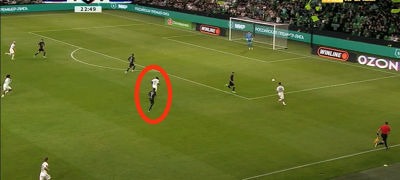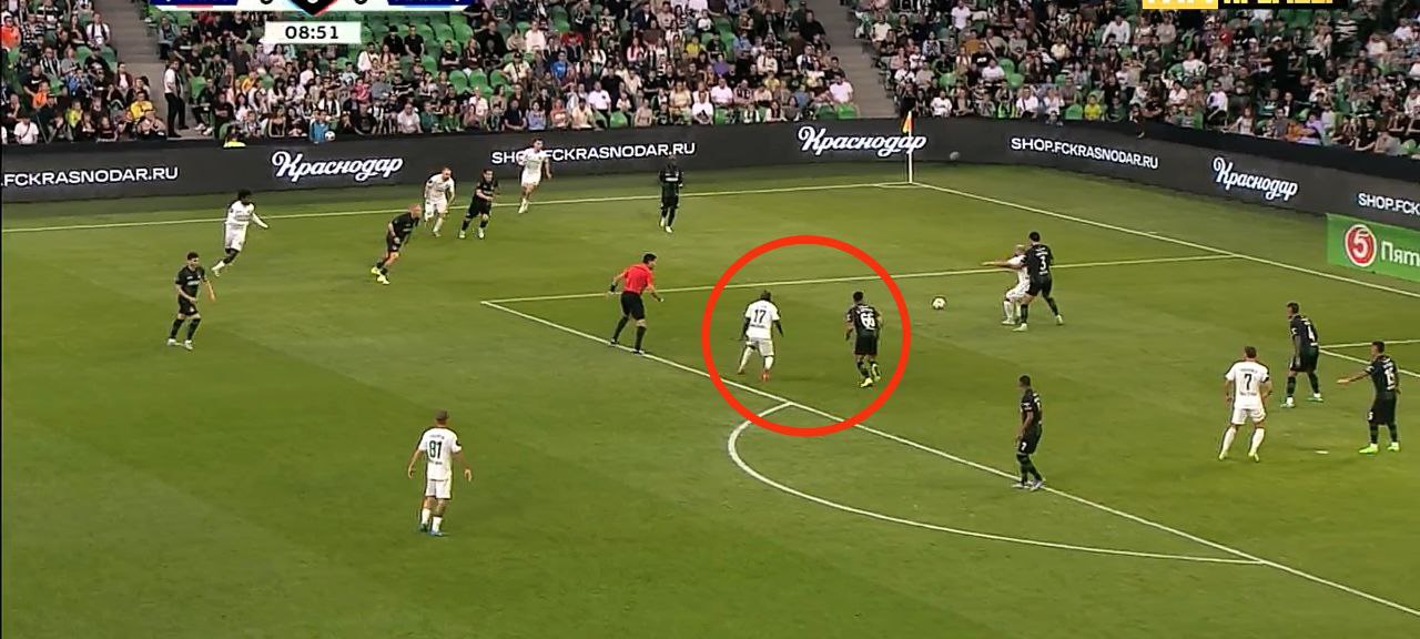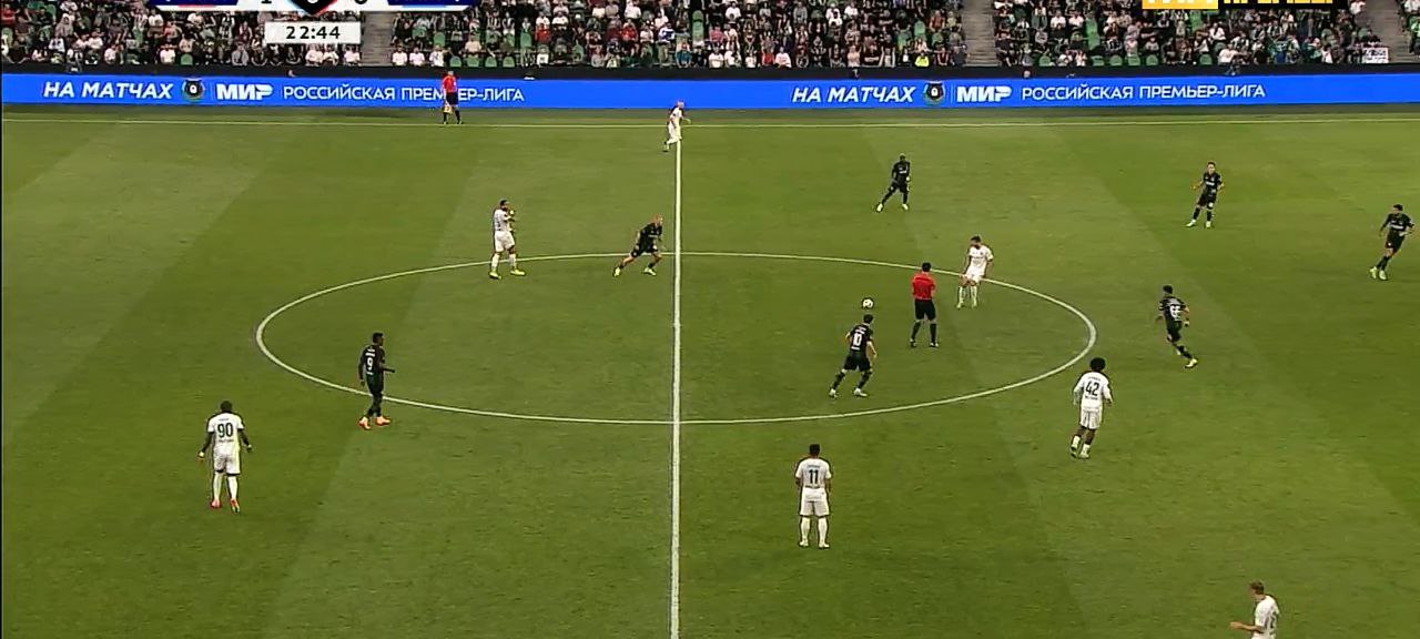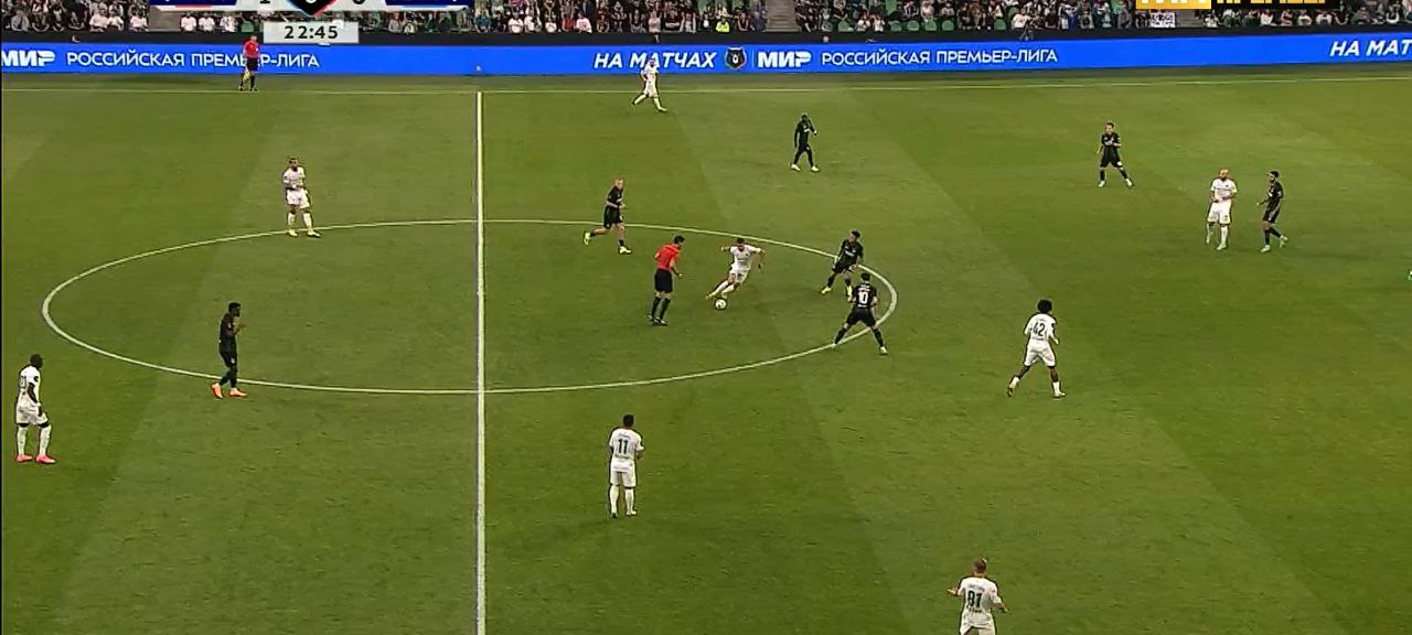 Моменту с Са и Касинтурой со скрина выше, например, предшествовал такой эпизод: Кривцов пошел в прессинг и оставил пустоту в центре, которую грамотно заполнил Лечи и получил пас от Гандри. Петров за Садулаевым не пошел.