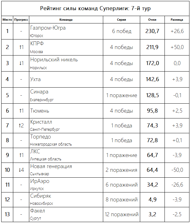 Больших изменений Рейтинг силы после 7-го тура не притерпел. Лишь «Новая генерация» «отметилась» падением аж на четыре позиции. На одно место поднялись «Тюмень» и «ЛКС», а «Кристалл» — на два.
