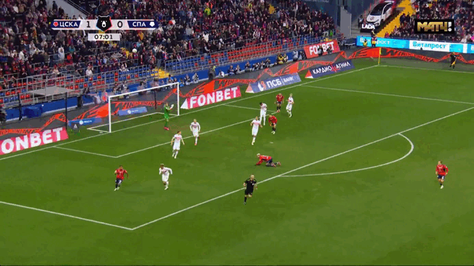 Ну как? Обратите внимание на мяч..Он Далеко от эпизода. Нападающий ЦСКА не делает никаких попыток его догнать, даже не смотрит на него..Он смотрит на игрока Спартака и зряче меняет свою траекторию в соответствии с тем как тот меняет свою при этом еще и оставляя ногу. Этот эпизод не подходит даже под классическое «подставился», потому как действия нападающего не обусловлены борьбой за мяч. Случайный контакт, причём инициированный игроком ЦСКА. Не более.