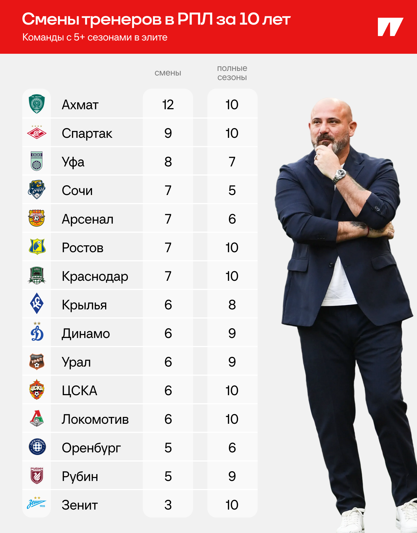 Мы выделили 15 клубов РПЛ за последние десять лет, которые провели не менее пяти сезонов в элите, и посчитали, сколько смен главных тренеров в них произошло за это время. Именно изменений на посту, не самих тренеров – с начала сезона-2015/16.
