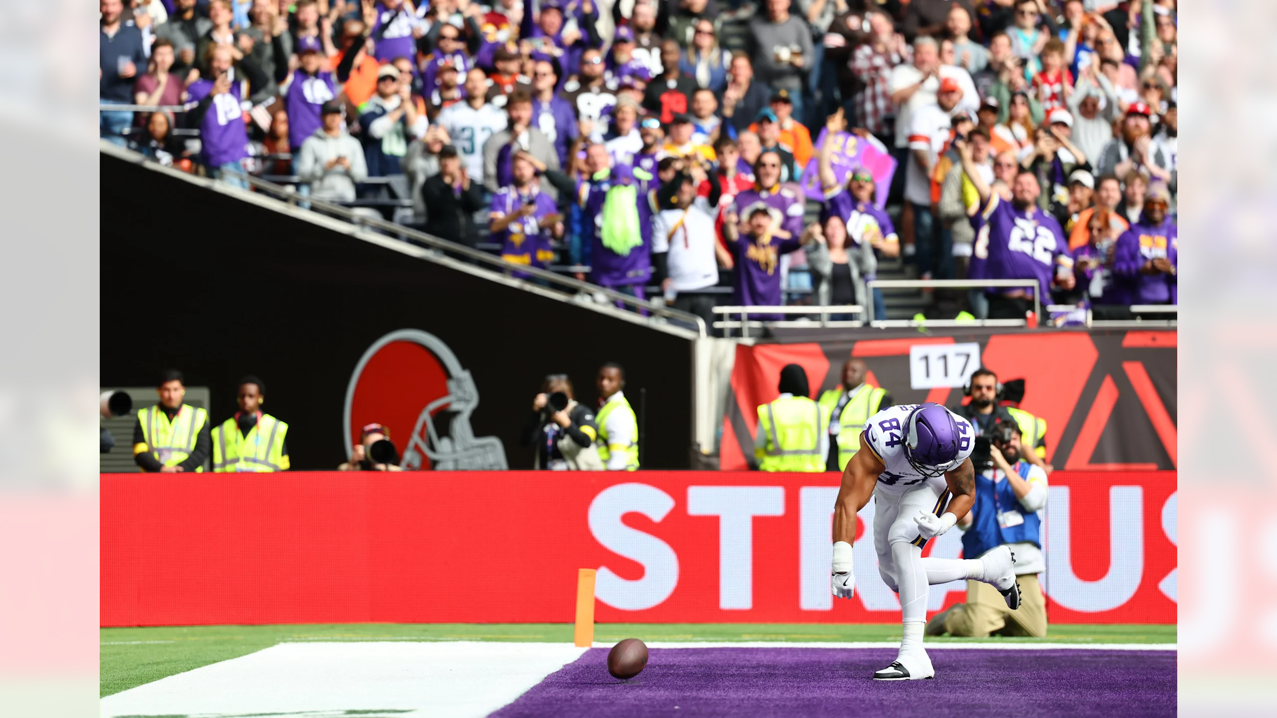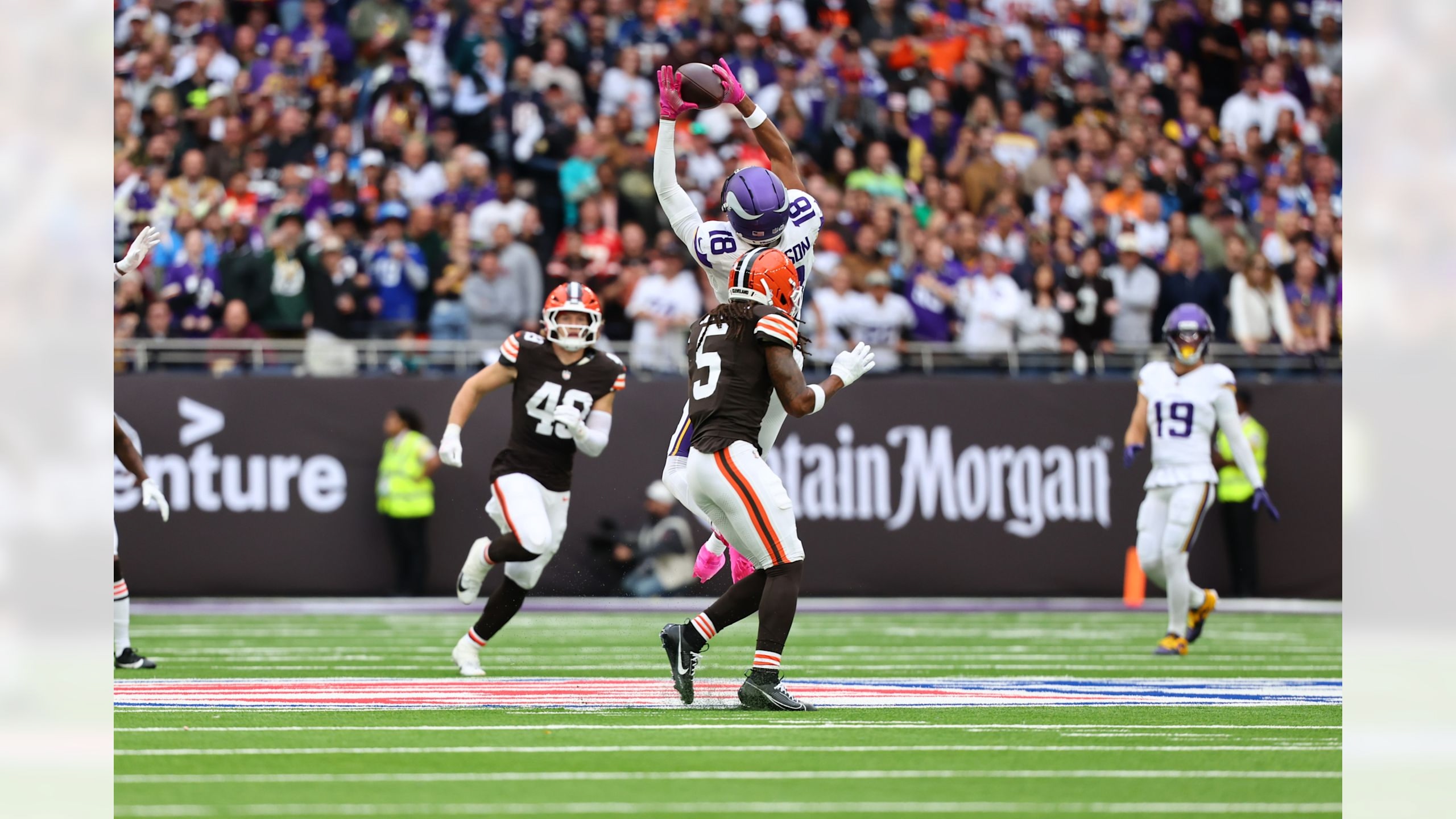 План «Миннесоты» в первой части матча заключался в том, чтобы мяч в максимально короткий временной промежуток времени покидал потные ладошки Карсона Венца. Логичный план коуча О’Коннелла, ведь за Карсоном снарядили охоту заряженные «Браунс» во главе с Майлзом Гарреттом. Избегать их захватов у Венца получалось неплохо, при таких розыгрышах мяч в основном отправлялся к Джастину Джефферсону (что логично), который в этот вечер был великолепен. В первой части матча его прикрывал Грег Ньюсом, и Джастин без шансов разделывал корнербека раз за разом. Каждый прием сопровождался фирменным трештоком, сквозь интершум проскакивало что-то там про крутые цепи и лютый свэг. Засчитано.