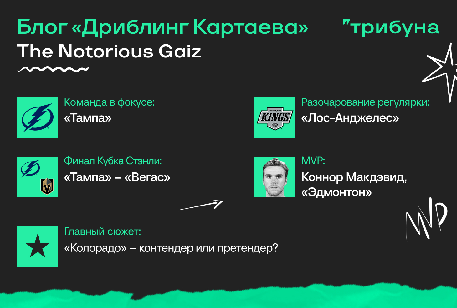 На Западе выбрать одну команду значительно сложнее. Тут и агрессивный на рынке «Вегас» с Митчем Марнером, и «Эдмонтон», который два года подряд выходил в финал, и «Колорадо», который если пазл сойдется (здоровый Ландескуг, отсутствие фокусов Ничушкина, сильная игра Нечаса в контрактный сезон и надежность Блэквуда), может стать один из главных контендеров.