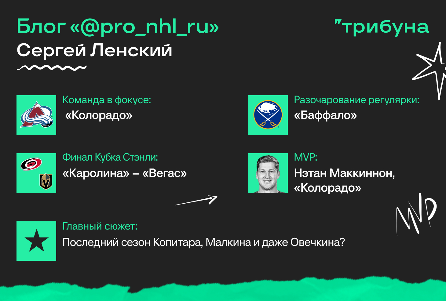 Маккиннон заслужил этот титул не только цифрами. Он стал настоящим двигателем «Лавин», его вклад видно во всем: количество голов, ассистов, участие в ключевых моментах – он постоянно создает преимущества для команды и ведет ее за собой. Маккиннон не просто набирает очки – он делает тех, кто рядом, лучше.