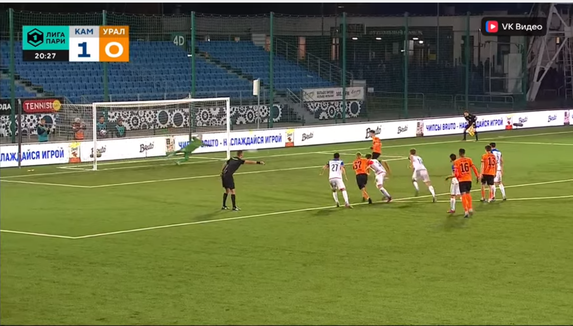 Буквально через минуту Султонов фигачит метров с 25-ти и мяч залетает за уши Мамина. Ноги его в это время четко стоят на земле. 0:2.