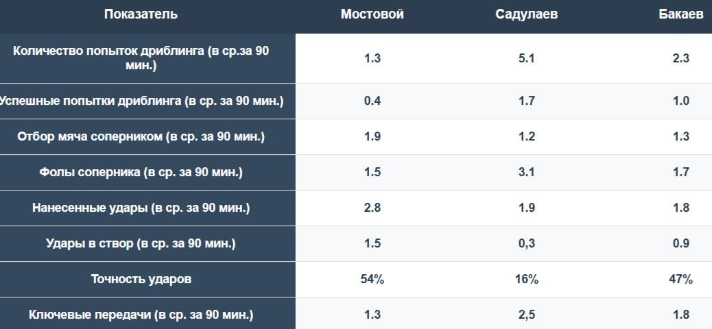 В этой статье будет часто сравнение с Бакаевым и Садулаевым. У Садулаева в нынешнем сезоне: 15 матчей и 1+2, у Бакаева в 14 играх 2+6, а у Мостового 15 и 3+2. Зелимхан по цифрам лучше, а вингер «Ахмата» стабильнее в игровом плане. Казалось бы, Андрей лучше по цифрам, но: