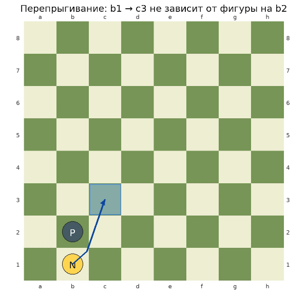 Схема 3. Прыжок через фигуру: ♘b1 → c3, пешка на b2 не мешает.