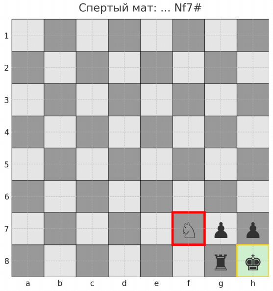 Спертый мат | Мат, когда поля бегства короля закрыты своими фигурами/пешками, а решающий удар наносит конь. |
