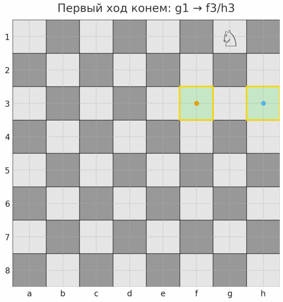 - Первый ход конем возможен. В начальной позиции конь уже может сделать первый ход (g1–f3 или g1–h3 и т.д.) — он перепрыгивает через пешки и фигуры.