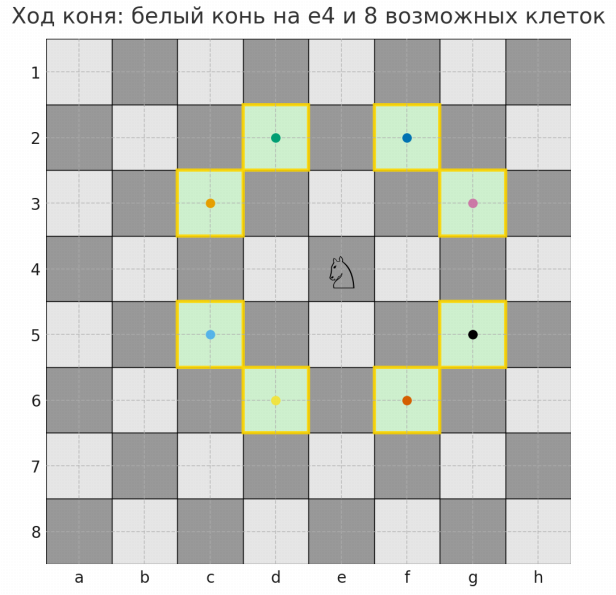 Схема 1. Ход коня: белый конь на e4 и 8 возможных клеток.