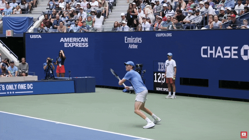 У Синнера нестандартный замах: ракетка описывает сложную петлю и при этом расположена не чуть выше головы, как у большинства игроков, а на уровне плеча. Такое положение ракетки уменьшает коридор для замаха, что, в свою очередь, должно уменьшить силу, с которой она коснется мяча.