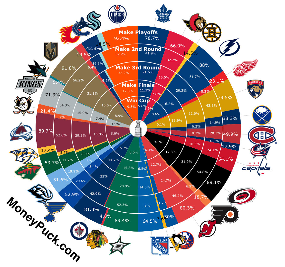 Наконец настал старт нового сезона. В его преддверии большое количество разных прогнозов на победителя кубка. Но не нужно относиться к этому слишком серьёзно. Слишком много факторов проявится в ходе чемпионата: удачи и неудачи отдельных игроков, новые тренерские системы, последствия усиления команд в межсезонье, ходы на дедлайн и т.д. Но всё равно интересно, посмотреть даже приблизительные расклады. Вот предсезонный прогноз от MoneyPuck.
