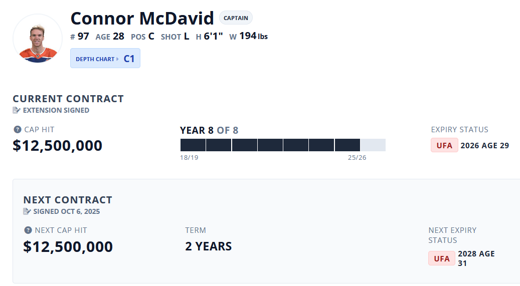 Для Коннора, этот срок помогает понять шансы Эдмонтона на кубок. На мой взгляд, речь идёт о двух годах. Заключённый контракт даёт два похода за кубком в команде, перед последним годом окончания соглашения. Когда игрок сможет принять решение, хочет ли он продолжить карьеру в Эдмонтоне, а клуб в свою очередь, если МакДи захочет уйти, сможет сделать достойный обмен. Разумеется, с заключением хоккеистом контракта с новой командой для максимизации прибыли.