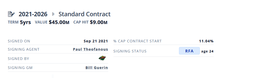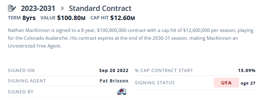 Я писал в прошлом посте, что игрок взял ниже рынка. Да, его AAV стало рекордным на тот момент. Но Мак, это законный 1C в команде-претенденте, важный элемент для завоевания кубка. По сообщениям авторитетных инсайдеров, речь шла о возможном AAV 14.0mln для игрока даже в Колорадо. Но Мак дал домашнюю скидку. Это легко найти поиском. Да и просто посмотрев на строку в картинке - «% Cap Contract Start 15.09%» и вспомнить про максимально разрешённый процент для одного игрока. Это был контракт с важной для него пороговой цифрой и максимальной домашней скидкой от этой цифры, сделанной родному клубу.