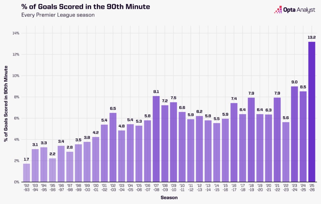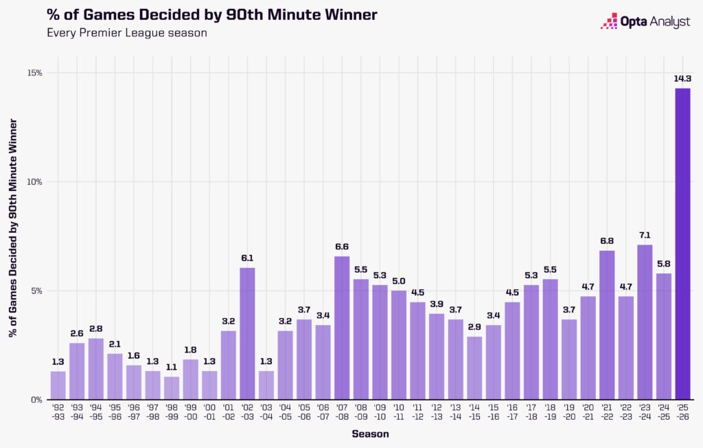 Но хотя матчи в наши дни стали длиннее, этот факт сам по себе не объясняет то, что произошло в текущем сезоне. В кампании 2025/26 забивается больше голов на 90-й минуте и позже, чем в любом другом сезоне в истории Премьер-лиги, но это не всё: большая доля матчей решается победными голами на 90-й минуте, чем когда-либо прежде.