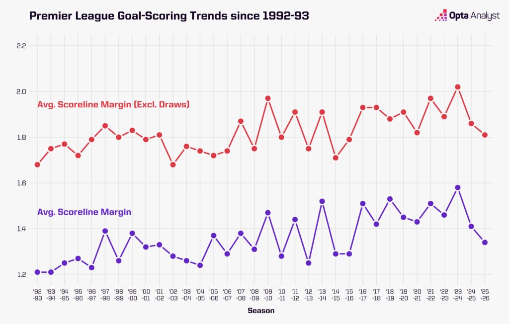 Однако сейчас этот показатель опустился до самого низкого значения за десятилетие: в сезоне 2025/26 команды разделяют в среднем 1.34 гола. По крайней мере, на данный момент создается впечатление, что в нынешнем сезоне в нижней части таблицы нет аутсайдеров, а крупные победы стали реже. В последний раз подобно низкий показатель наблюдался в сезоне 2015/16, когда в лиге не было безоговорочного лидера, а сильнейшие команды Премьер-лиги были настолько равны, что титул завоевал аутсайдер с шансами 5000 к 1 — «Лестер Сити».