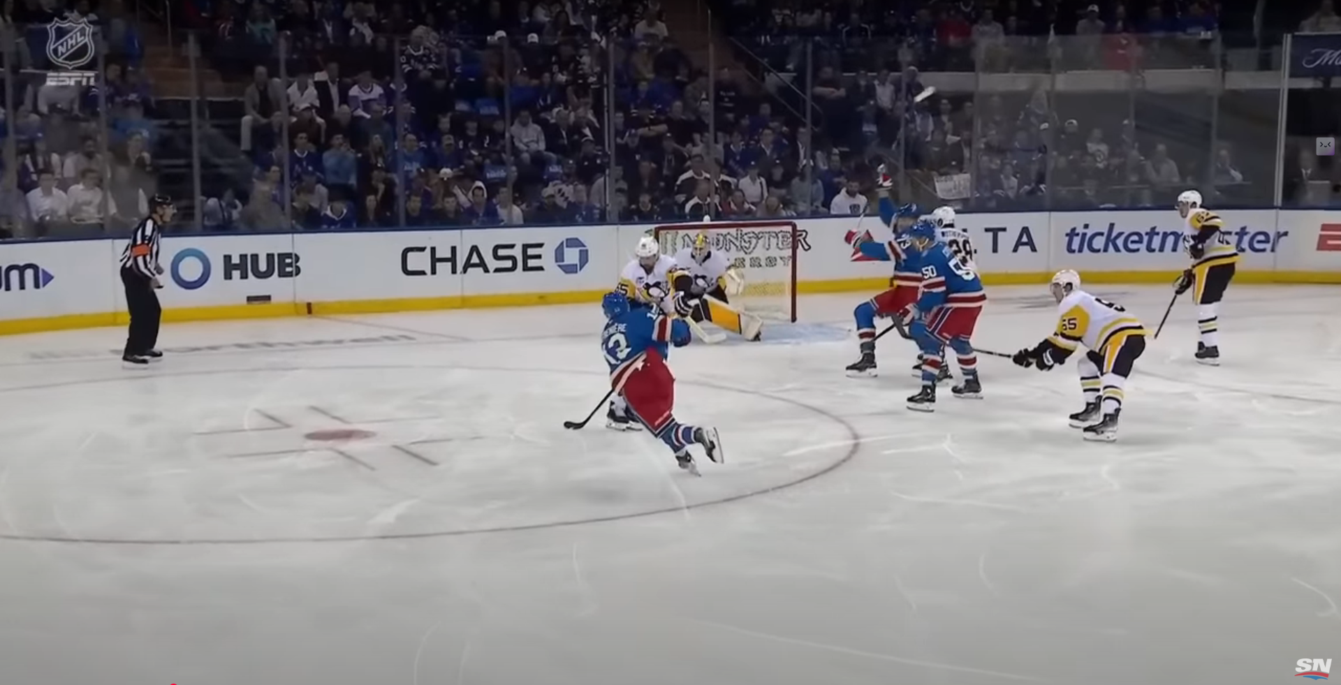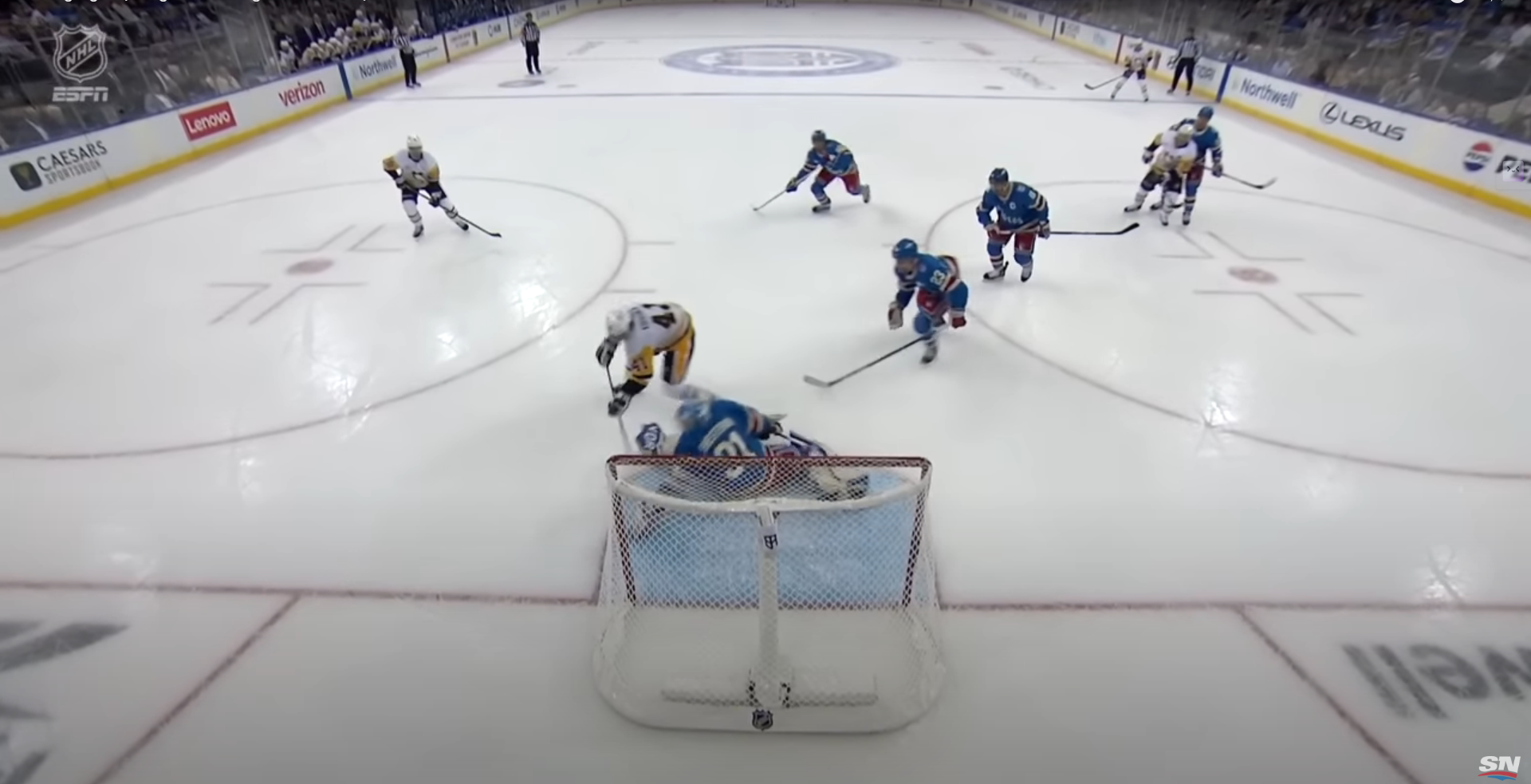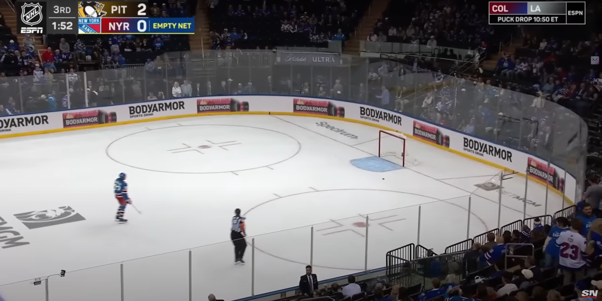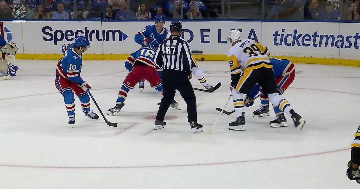 Первый период катился к нулевой ничьей, когда после проброса случилось то самое вбрасывание у ворот «Рейнджерс». На точку встал Евгений Малкин. Забегая вперед, скажу, что у Джино в этом матче ужасный показатель в игре на вбрасываниях. Из 7 он выиграл всего одно. Именно то, о котором сейчас пойдет речь.