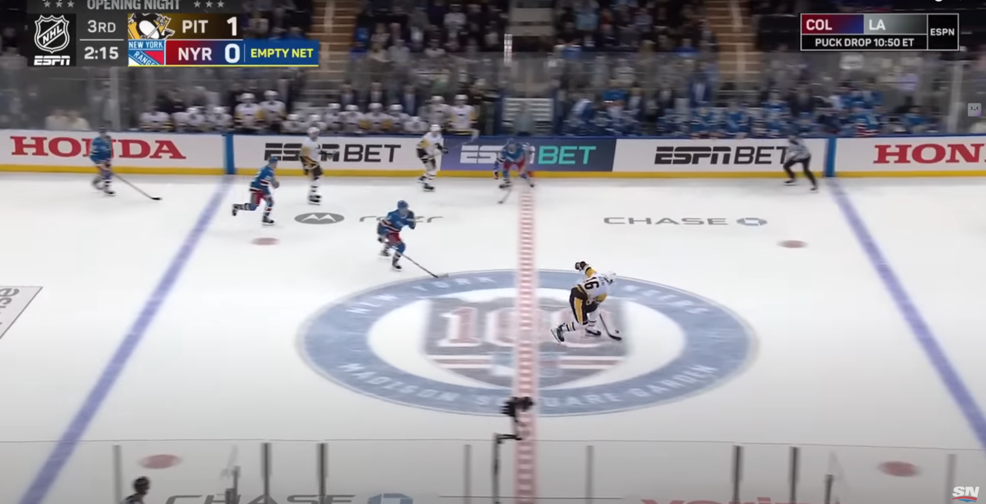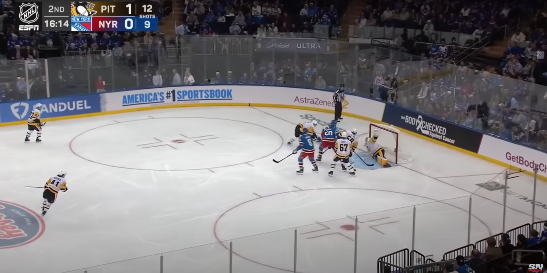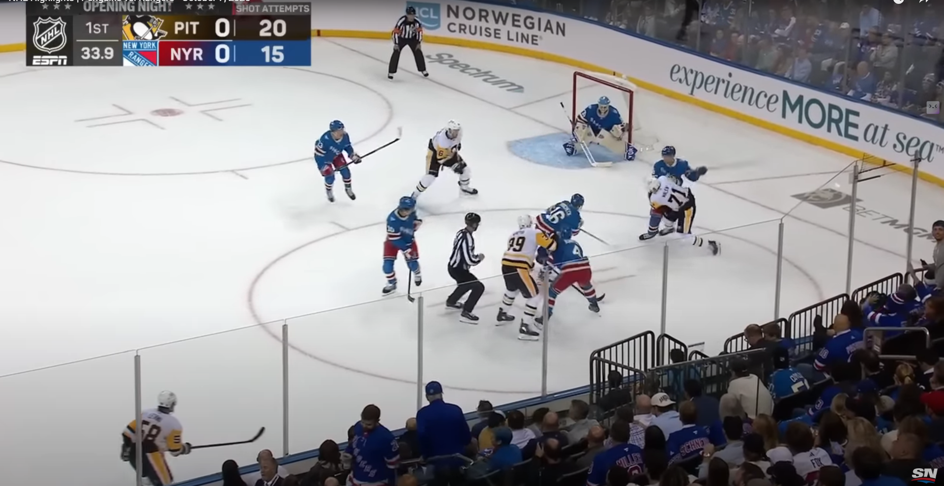 Первый период катился к нулевой ничьей, когда после проброса случилось то самое вбрасывание у ворот «Рейнджерс». На точку встал Евгений Малкин. Забегая вперед, скажу, что у Джино в этом матче ужасный показатель в игре на вбрасываниях. Из 7 он выиграл всего одно. Именно то, о котором сейчас пойдет речь.