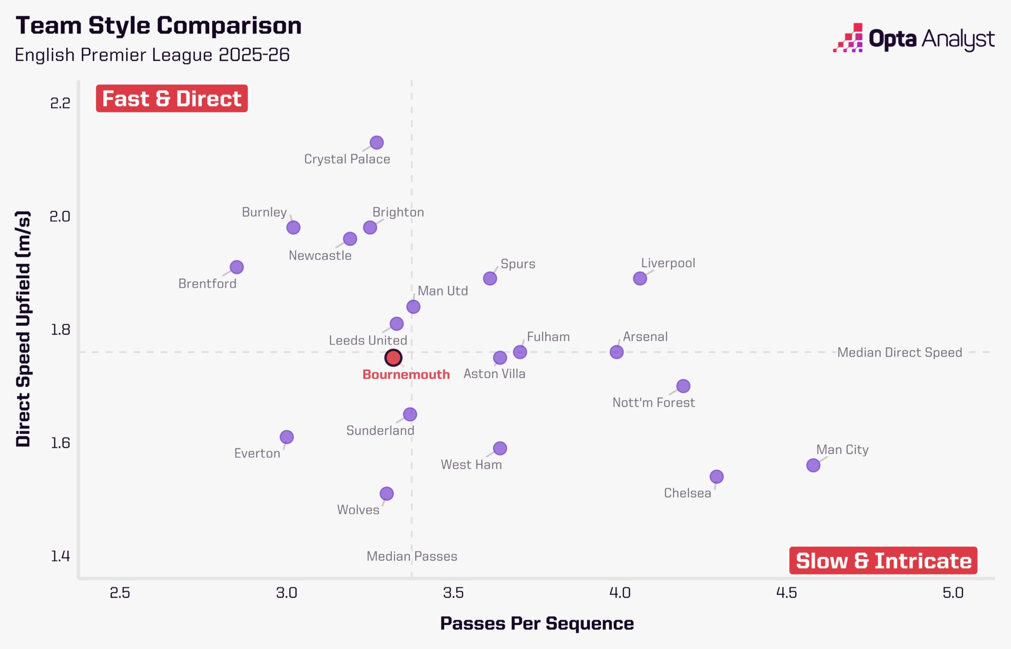 Владея мячом, «Борнмут» удерживает его в среднем всего 8,7 секунды за одну атакующую серию и совершает в среднем лишь 3,3 передачи. Если взглянуть на приведённую ниже диаграмму стилей команд, то, за исключением «Кристал Пэлас», команда Ираолы разительно контрастирует с неторопливым позиционным нападением коллективов, находящихся рядом с ней в таблице.