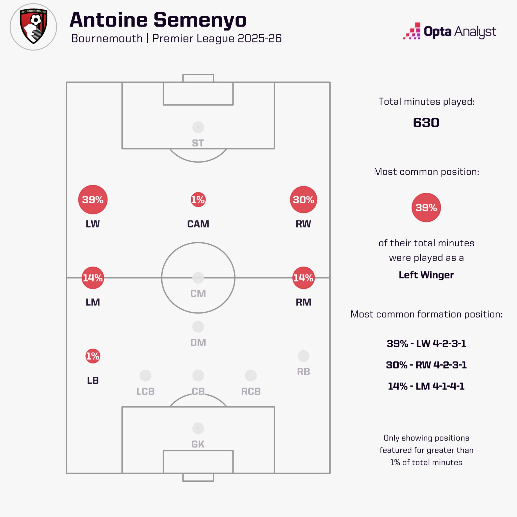 Что ж, это к лучшему. Пока Семеньо, возможно, не заглядывает в статистику, мы делаем это за него. И цифры полностью подтверждают то, что и так видно невооруженным глазом: Антуан Семеньо — лучший игрок «Борнмута», а на данный момент, возможно, и лучший футболист во всей Премьер-лиге.