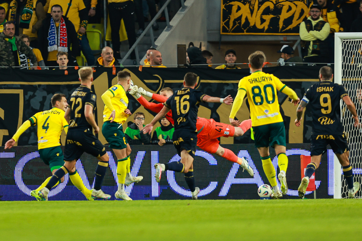 Датчанин не стал серьезно менять стартовый состав «портовцев», на матч с гливичанами с первых минут вышли и Гросицки, и Гринвуд, и Мольнар, и Джувара. Последний уже 18-й минуте головой пробил в перекладину ворот Плаха, а с добиванием Гросицкого справился словацкий вратарь гостей, после чего второе добивание Камиля успел заблокировать Драпиньски. Щецинцы продолжали атаковать, рядом со штангой пробил Джувара, а с ударом Мольнара справился Плах. На 40-й минуте подача углового закончилась голом Ндиайе. Но долго щецинцы в счете не вели.